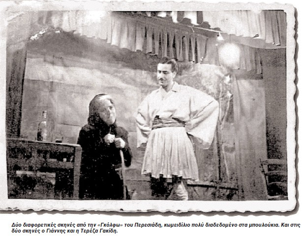 Jöttek a szárazföld minden területéről a "θεατρικά μπουλούκια" - vándorszínészek. Ők tehetséges, jókedvű, sokszor csak egy rövid időre összeverbuválódott kis banda volt. Minden falunak volt vagy egy főtere, vagy egy „Kátóga” káfenió-ja. Ott játszottak ők. Megnéztek egy-egy mozielőadást és színdarabot csináltak belőle. Előfordult, hogy csak egy valaki nézte meg a filmet. Utána ő volt a színésztársaság vezetője és egyben a rendező is. Betanította a mozifilm részleteit színpadra alkalmazva, és azokat adták elő ezekben a kicsiny falvakban. Így történt ez itt Potámiában is.