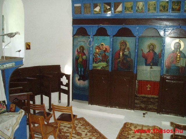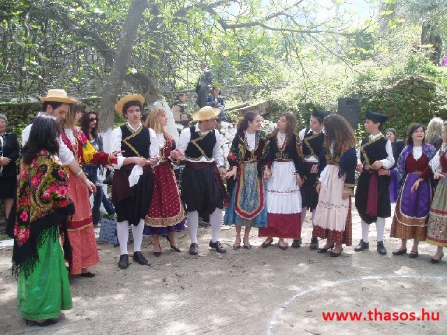 A liturgia után a Metoxi kolostor udvarán felállították magnójukat. Egy flekkenezőt is oda tettek. Ki sütött, ki rögtön táncolt is. Majd jöttek a falu többi emberei is, és évről évre hozzátett valamit e szép hagyományhoz. Kora reggel kezdődik a liturgia, mely kb. 11.00 órakor ér véget az egyházi étel szétosztásával az előző nap böjtölő emberek közt. A bárányos étel után kezdődik a közös mulatság. Talán a régi magyar május elsejére emlékeztető a kép és a hangulat. A sziget összes lakója itt van ezen a napon. A hegyoldalban sátrak, flekkenezők. Ki-ki készül egy kis csemegével az egész napos mulatságra. Megy a népi tánc, örül mindenki és a társaságok köszöntik egymást. A nép oly nagy hanggal van, hogy a szintén hangos forrás csobogását csak az hallja, ki szomját oltani a kúthoz megy.