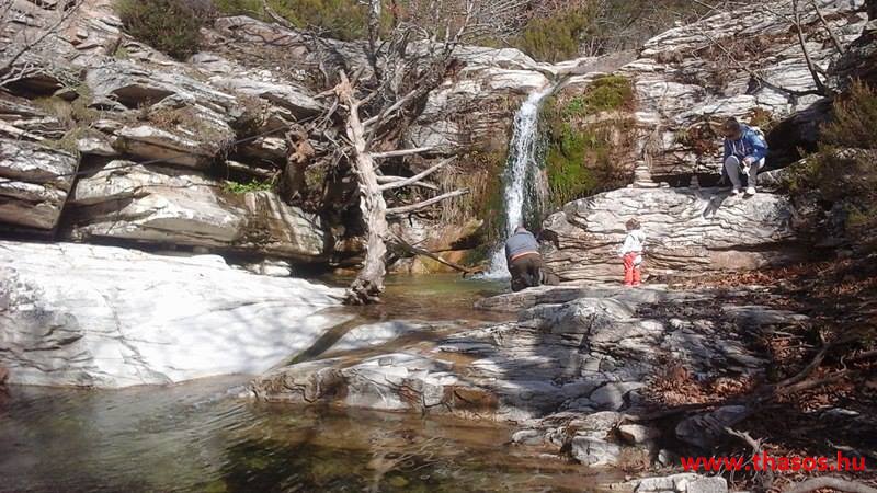 A vízcsobogás, a szél elcsendesülő, majd felerősödő játéka, mindenféle madártrilla, a fenyőtoboz kipattanásának alapzaja, ezek mind-mind egy édes dallamként fogadtak bennünket. A mindenfelé sárgán világító kicsiny krókuszok, a hó alól kibukkanó hóvirág, a kicsiny cserjék hamvas üde zöldje. Minden oly szép, oly fenséges, leírni azt nem lehet. Érezni kell azt. Flekkeneztünk, pihentünk, majd kora délután hazaindultunk. A Jenna tónál újra megálltunk. Tudatosan. Akik gyalogtúrával mennek oda Mariesből, a mézárus placc előtt a sziklaoldalban van egy, túrázók által a sziklára tett jelölés. Nyíl mutat lefelé, a sziklára rajzolva. Nyíl és Ypsárió. A járatlan túrázót ez arra készteti, hogy az igen meredek falon felkapaszkodjon. Pedig a nyíl lefelé mutat. De ha már felmászott, úgyis rájön, hogy oda feleslegesen mászott fel. A nyilat szembe mutatónak szánták, akik felfestették. Jelzik, hogy szemben az Ypszárió egy patakjának a kb. 6 méter magas vízesése van. Ez a tó mögötti folyó szurdokvölgyben, igen rejtett úton található. A látvány mindent megér. Leereszkedtünk hát a mélybe a nagy-nagy vízeséshez. E vízesés nem a tótól jön. A tónak a vizét vastag csőbe gyűjtik és vezetik Maries hegyi falujához. Az Ypsárióról több patak a hegy nem járható részein csörgedezik, és itt is a felületes gyors turista számára örökre rejtve marad. A vízesés patakja egészen Mariesig halad. Több belső kis tóval csipkézett, óriási platánokkal szegélyezett. Mariesnél a vizét hasznosítják, majd a többletet engedik aláfutni egészen a 12 km-rel lentebbi parti falurészbe, hol a tengerbe fut. A hegyi Maries alatt van egy kápolnánál egy kiépített pihenő park. Odáig még nyár végén is csordogál a vize. De onnan tovább elveszik. Ki tudja, talán az állattartók, vagy a márványfeldolgozó üzem használja azt fel.