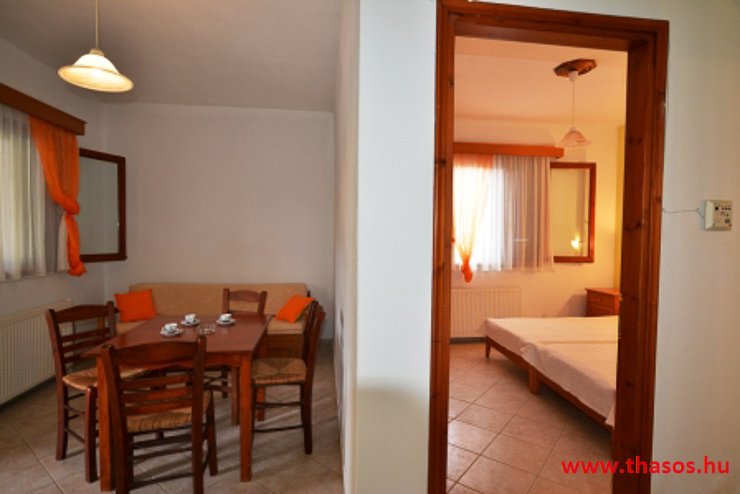 A lakás elrendezése: a nappaliban konyha, hűtőszekrény, ebédlő és tv-szalon, dupla kanapéágy. A nappaliból nyílik a terasz, valamint a fürdőszoba és a hálószoba. A szállás kérésre ad babaágyat is.