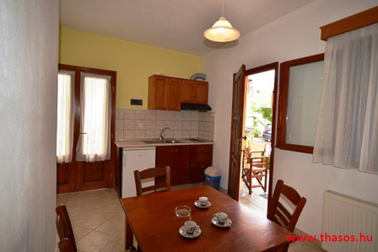 A konyhája közepes ételek elkészítésére elegendő. Serpenyőzés, flekkenező sütés lehetséges a házhoz tartozó kicsiny, erre kialakított területen. Mikrohullámú sütő, melegszendvics készítésére szolgáló berendezés nincs. Vízforraló és alap edények vannak.