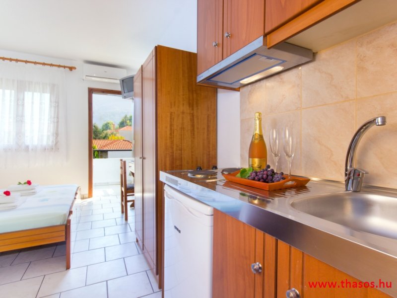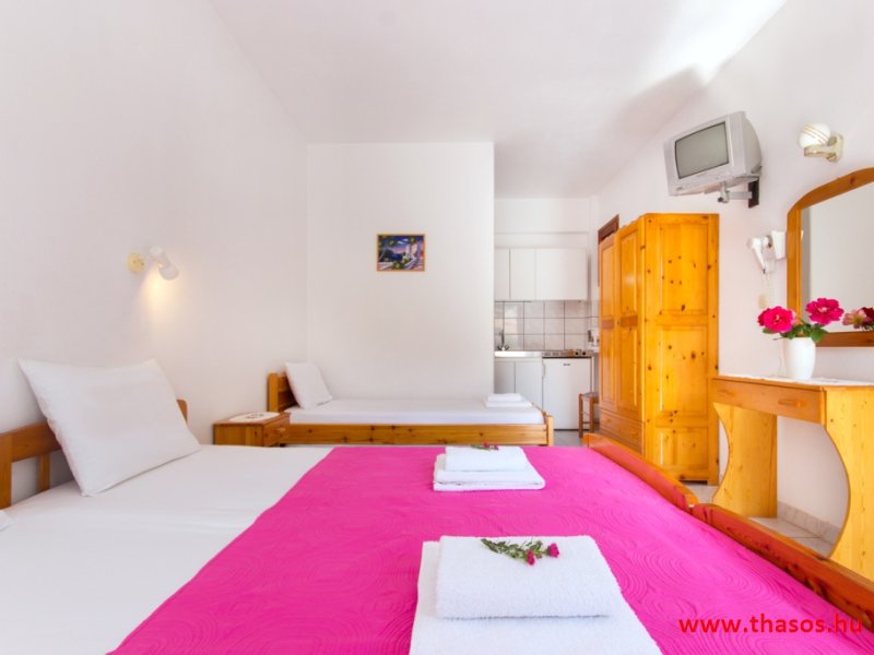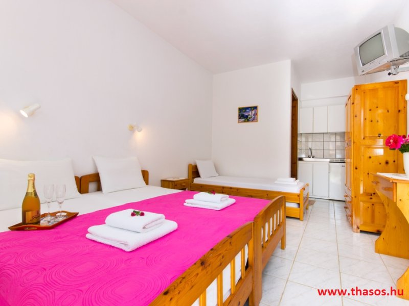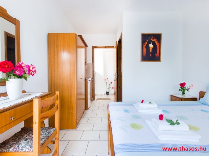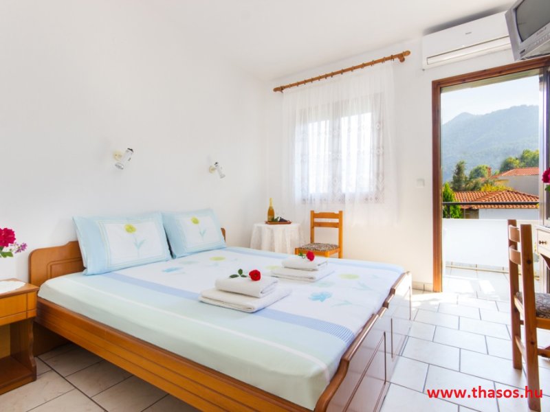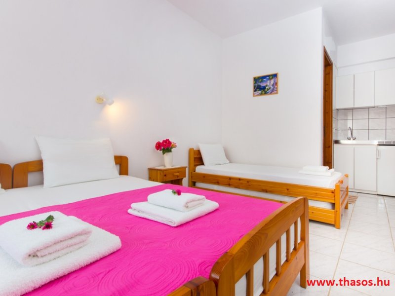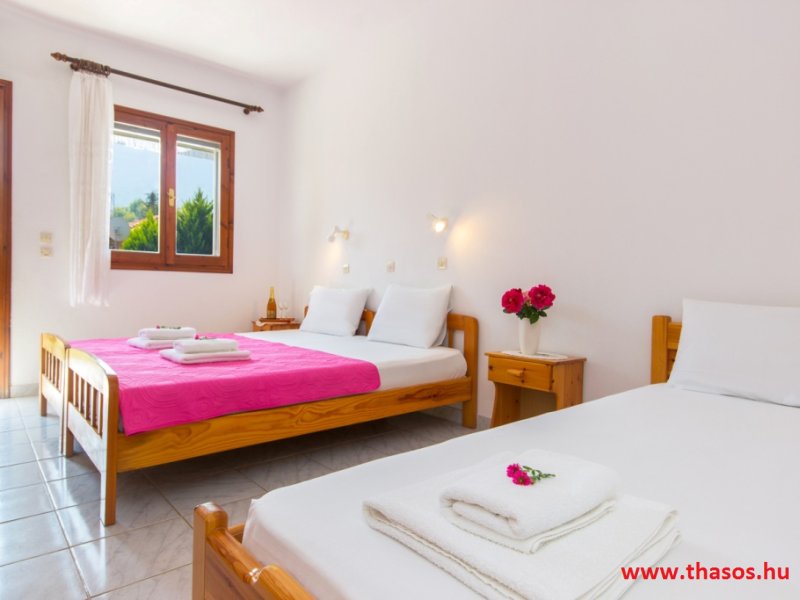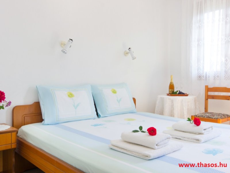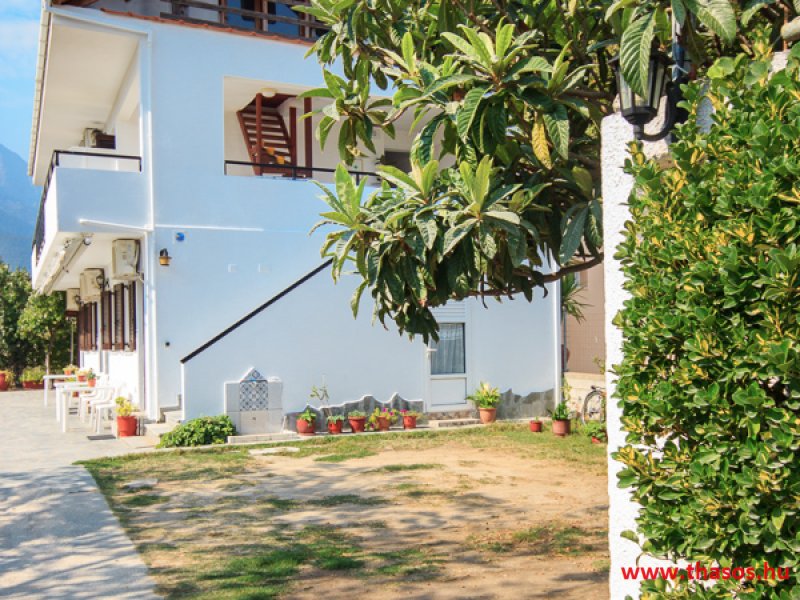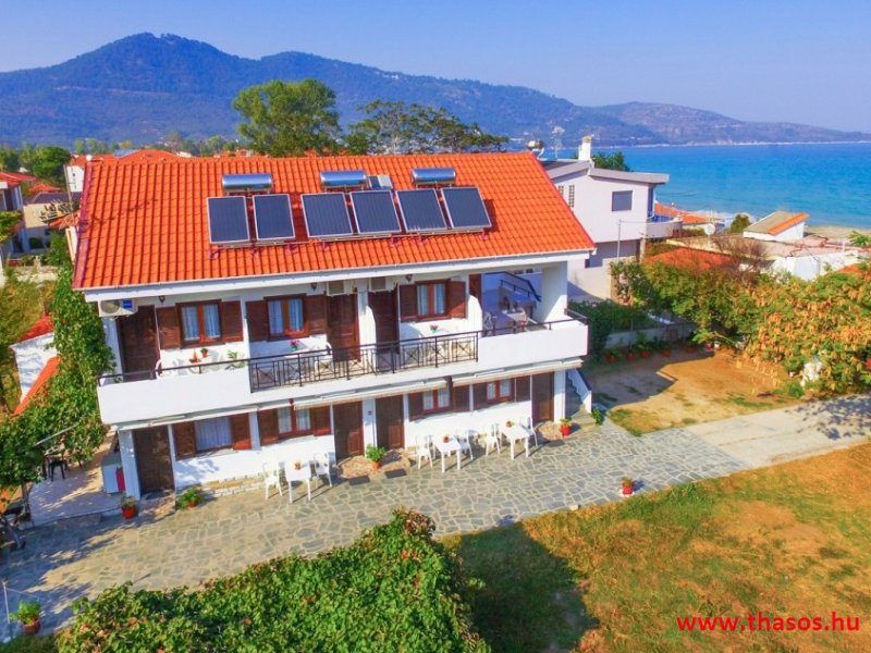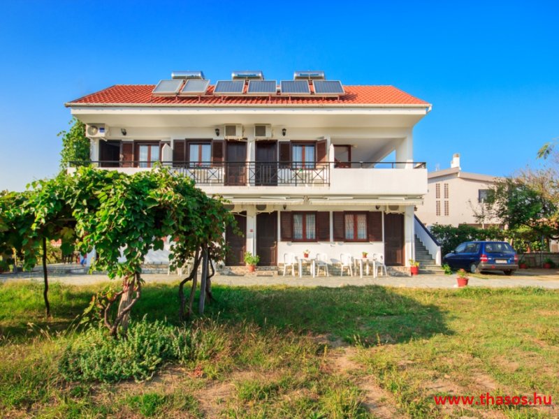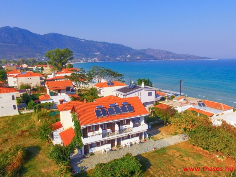 Fekvése: a központi nagystrand és a centrum közötti partszakaszon. A nagypapa halász bungalója mögé építve, ez által teljes biztonságot adva a kisgyermekes családoknak, hogy a gyerekek nem futhatnak le észrevétlenül a tengerhez. Az épület oldalsó fronttal fekszik a tenger felé, de a víz közelsége miatt mégis tökéletes rálátással úgy az erkélyekről, mint a teraszokról. Nyugodt, de jól ellátott környék. Bejárat csak a strand felőli földes bekötőútról. Ez az út gyér forgalmú, leginkább gyalogos strandolókat jelenti. Az esti órákban kizárólagosan csak gyalogosan, a centrum tavernákhoz vezető sétányként használható. Az emeleti stúdiókhoz oldalt egy külön leválasztott térben van egy nagy társaság számára kiépített étkező terület, ahonnan fantasztikus kilátás van a tengerre. Ezt a kiépített részt inkább az emeleten lakók használják. Az emeleten lakók részére a feljárás a ház tenger felé eső oldalán van. Parkoló is rendelkezésre áll. Emelet: 1. 2 normál méretű ágy egymás mellett. Az egyik ágyből egy kihúzható normál ágy. 2.. 2 normál ágy egymás mellett. Baba ágy külön kérésre lehetséges.. 3. 2 normál ágy egymás mellett. Az egyik ágyból egy kihúzható normál ágy. 3db 2 ágyas emeleti stúdió légkondicionáló berendezéssel, erkélyekkel. Ebből a kettő szélső lakás rendelkezik kihúzható és szintre emelhető ággyal, de ez hely szűkösséget jelent. Csak rendkivüli esetben ajánlom.. Akényelem szempontból inkább csak kis gyermekek részére jó. Mérete felnőtt méret, de nem marad az ágyak közt hely. Az erre való figyelmet köszönöm. Földszint 3db 2+2 ágyas földszinti stúdió 2 db normál ágy egymás mellett. Egy normál ágy. Abból szükség esetén kihúzható normál ágy. Ez már hely szűkös teret ad. Az ágyak felnőtt méretek, de a hely tere miatt szűlők és kettő kicsiny gyermekre javasoljuk. Minden lakásban van légkondicionáló berendezés. A lakások ára felett plusz költség lesz a minden évben a vendég által helyben fizetendő extra turisztikai adó. 2025.évben ez 2 Euró/lakás volt/éjszaka. Extra fő 7 Euró/éjszaka/lakás. Képek a szállásról Képek az öbölről
