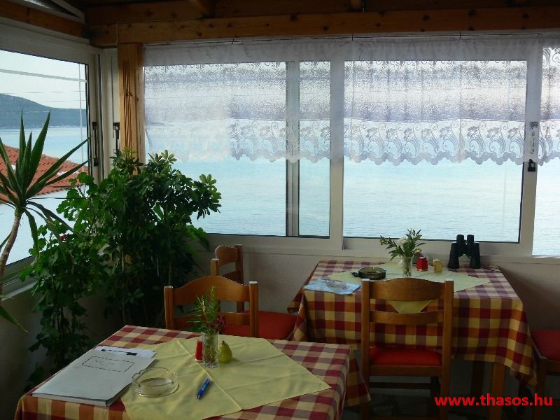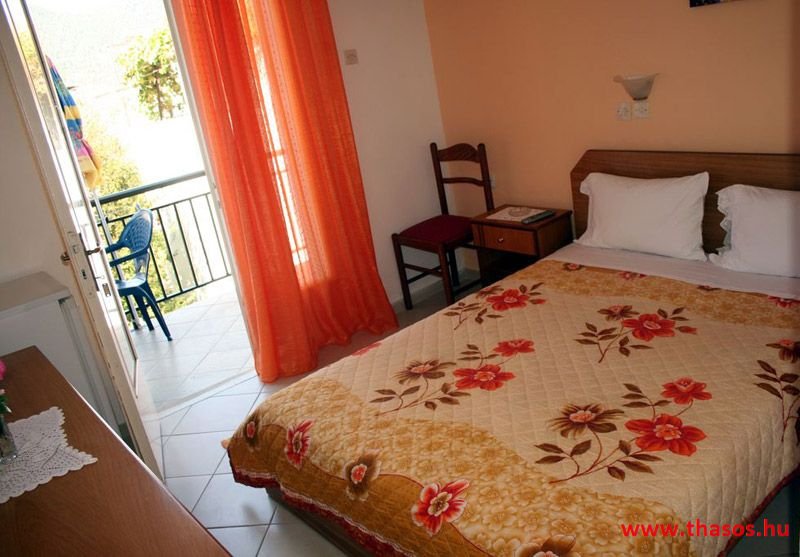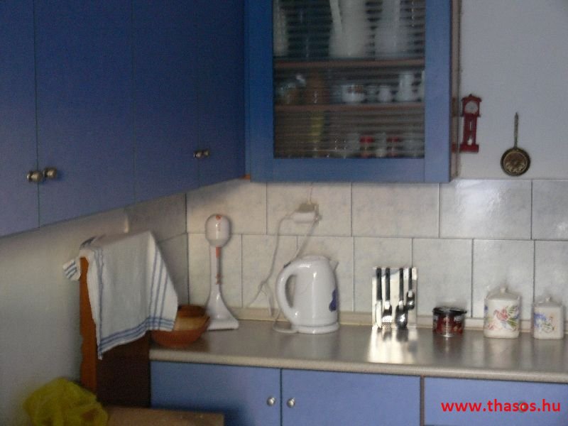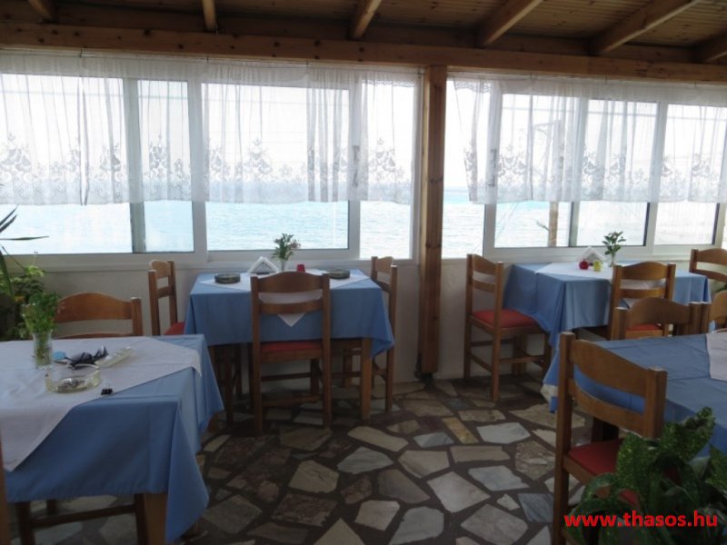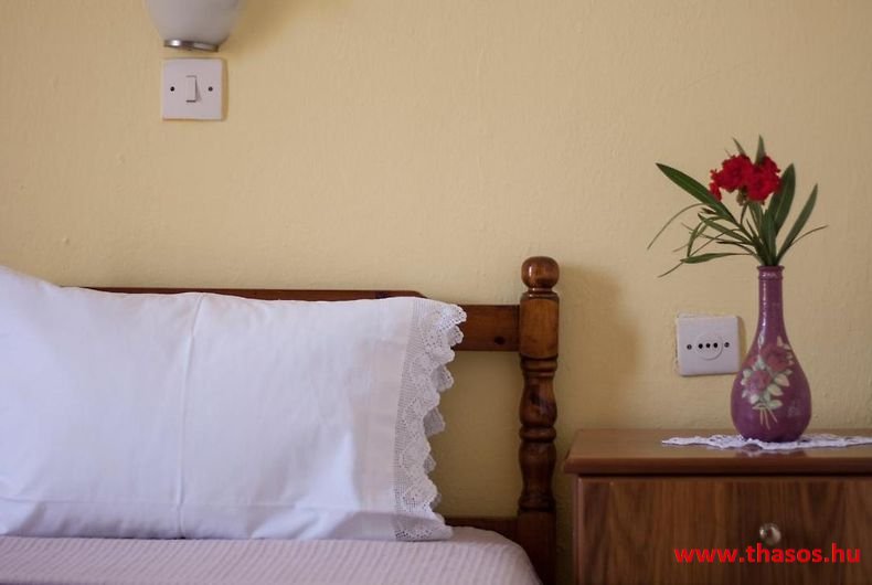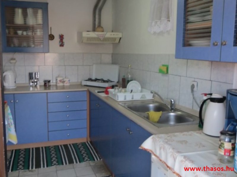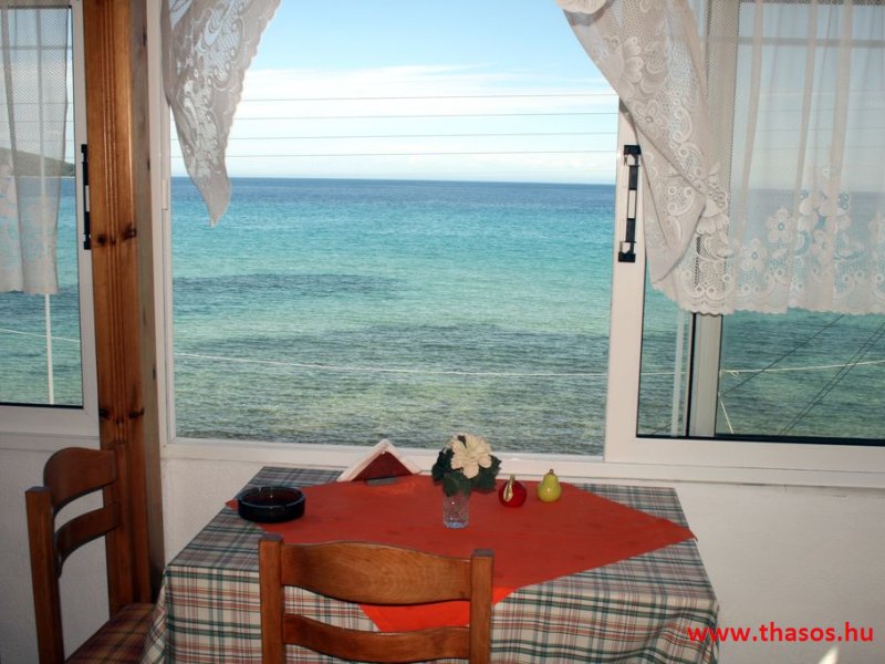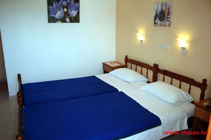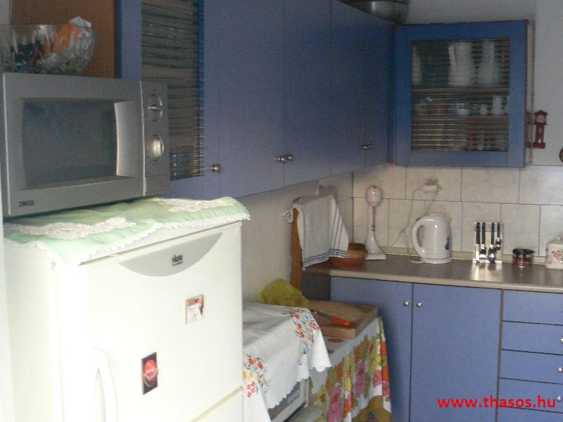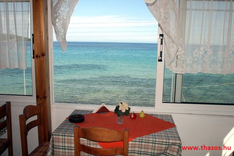 A lakások berendezése a hagyományos görög lakások stílusa, egyszerű, de tiszta és férős. A konyha és étkező a második emeleten van. A konyhában nagyobb társaságok minden típusú ételt készíthetnek. Étkezési lehetőségek: egy nagy társaság részére a külön helyiségű emeleti ebédlőben, vagy a belső parti udvar erre kialakított két területén, vagy a lakások saját teraszán. A lakásokban tehát belső konyha nincs, csak kávéfőzésre alkalmas kis turista gázfőző. A lakásokban az ágyak elhelyezése is olyan, hogy nyitott ajtó esetén, akár az ágyban fekvő helyzetből is elénk táruljon a tenger teljes képe. Minden lakásban van egy derékig érő, tehát normál nagyságű és közepes teljesítményű, felül egy fagyasztó fiókkal ellátott hűtőszekrény. A lakások berendezése tehát hálószobabútor, főzés néküli teakonyha sarok a hűtőszekrénnyel, zuhanytálcás fürdőszoba, hol hajszárító is van és a terasz az asztalkával és a hozzá tartozó székekkel. A gyermekek játszására csak a tenger homokos partszakaszán van lehetőség. Flekkenezési lehetőség a mobil flekkenező készülékkel a belső udvarrészen.