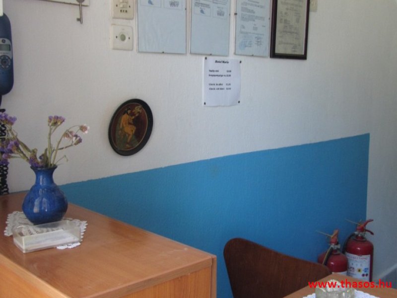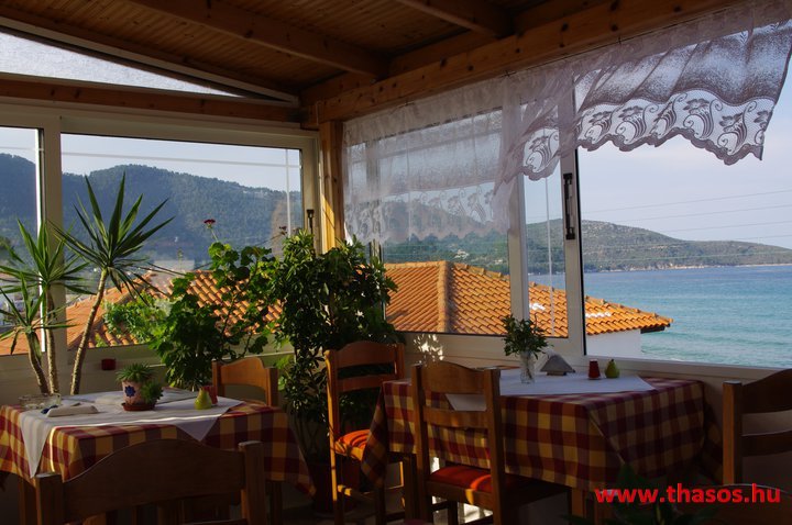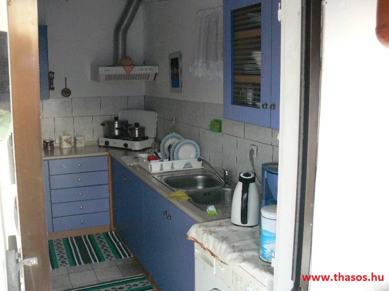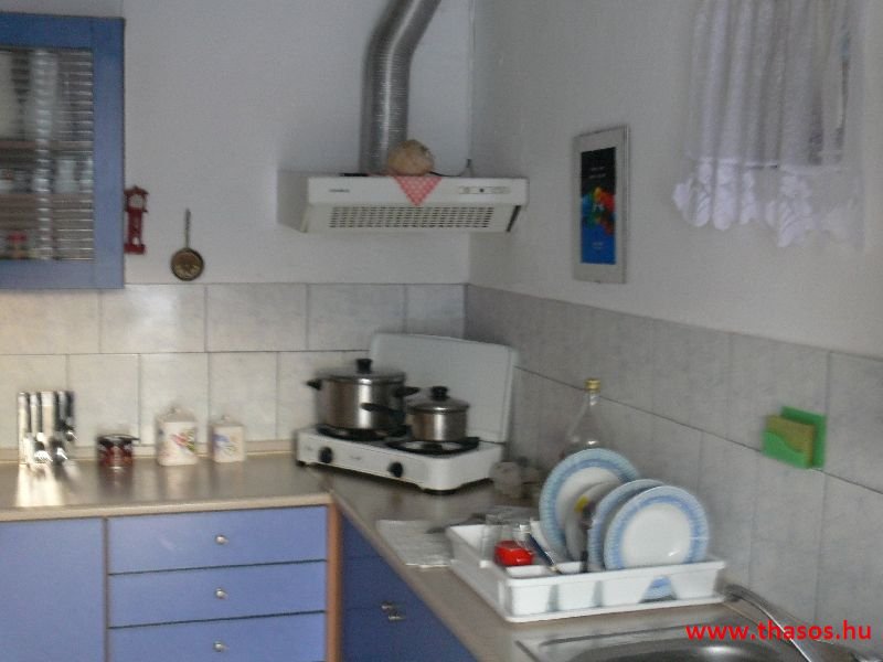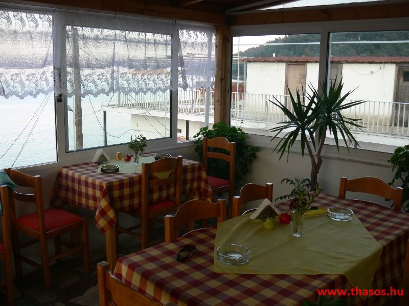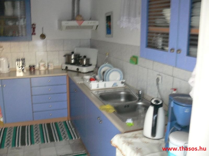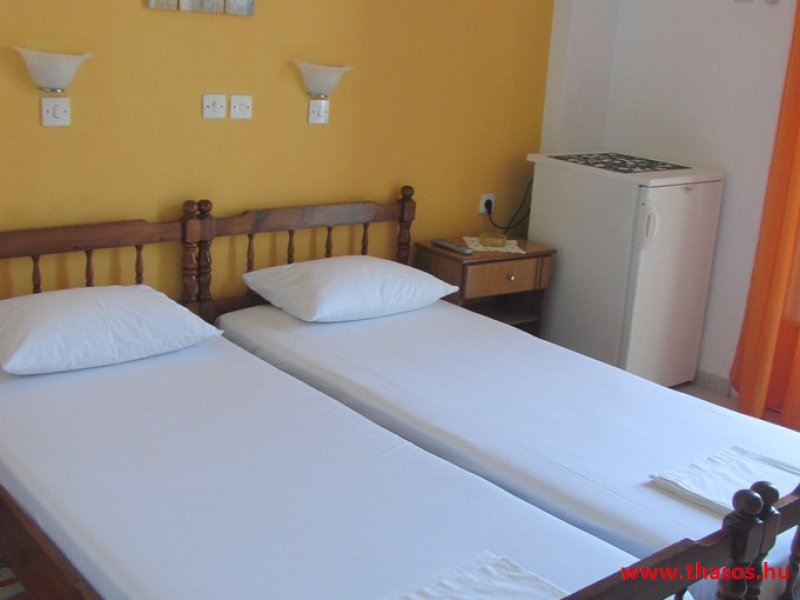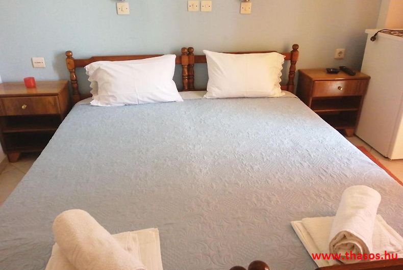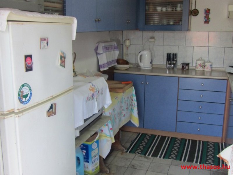 A lakások berendezése a hagyományos görög lakások stílusa, egyszerű, de tiszta és férős. A konyha és étkező a második emeleten van. A konyhában nagyobb társaságok minden típusú ételt készíthetnek. Étkezési lehetőségek: egy nagy társaság részére a külön helyiségű emeleti ebédlőben, vagy a belső parti udvar erre kialakított két területén, vagy a lakások saját teraszán. A lakásokban tehát belső konyha nincs, csak kávéfőzésre alkalmas kis turista gázfőző. A lakásokban az ágyak elhelyezése is olyan, hogy nyitott ajtó esetén, akár az ágyban fekvő helyzetből is elénk táruljon a tenger teljes képe. Minden lakásban van egy derékig érő, tehát normál nagyságű és közepes teljesítményű, felül egy fagyasztó fiókkal ellátott hűtőszekrény. A lakások berendezése tehát hálószobabútor, főzés néküli teakonyha sarok a hűtőszekrénnyel, zuhanytálcás fürdőszoba, hol hajszárító is van és a terasz az asztalkával és a hozzá tartozó székekkel. A gyermekek játszására csak a tenger homokos partszakaszán van lehetőség. Flekkenezési lehetőség a mobil flekkenező készülékkel a belső udvarrészen.