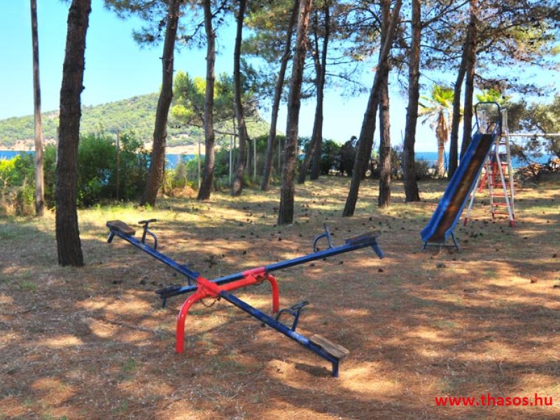 A medence és az étterem oldalánál van egy nagy parkos rész, hol gyermekjátszótér is ki van képezve.