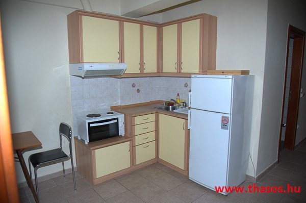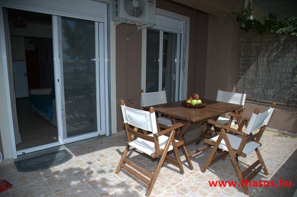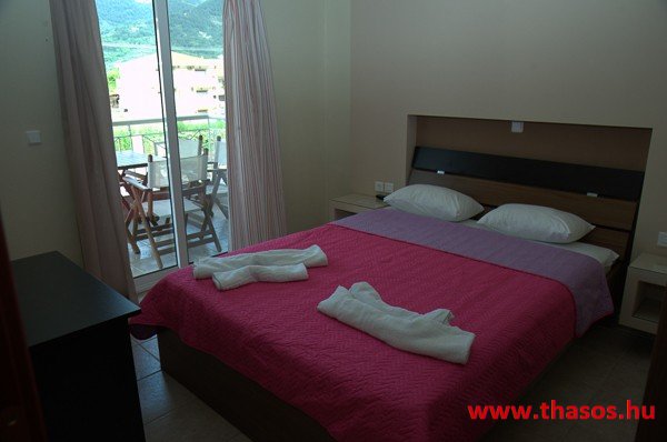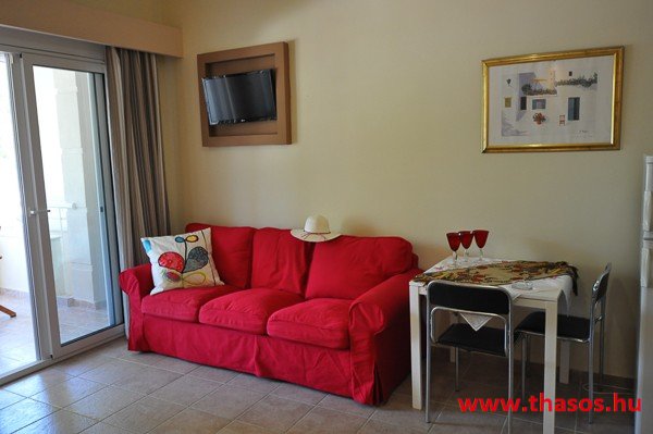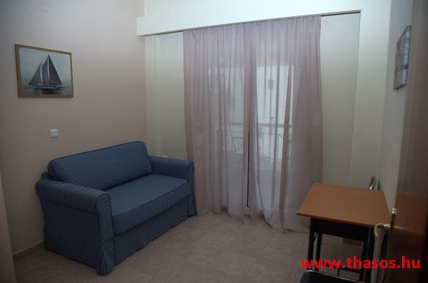 A stúdióban franciaágy, étkezősarok asztallal és székekkel. A konyhasarokban csak hűtőszekrény található, így csak hideg ételek elkészítésére alkalmas. A különálló, zuhanyzós fürdőszoba nagy méretű. Kényelmes terasza van, ahonnan kilátás nyílik az Ypszário-hegyre. Ez a stúdió két személyt vagy egy kisgyermekes párt képes befogadni.