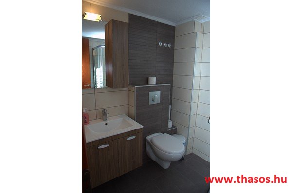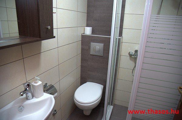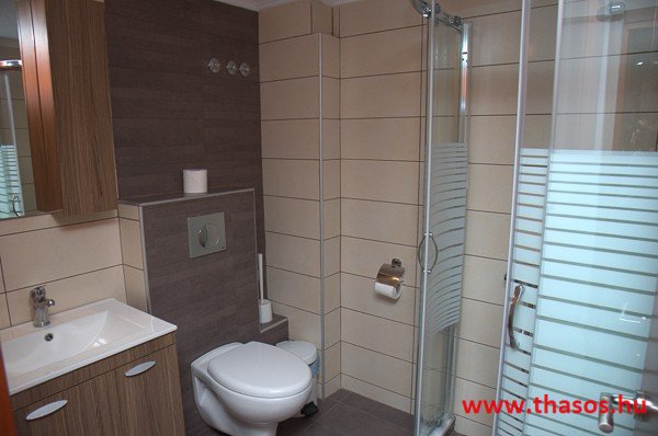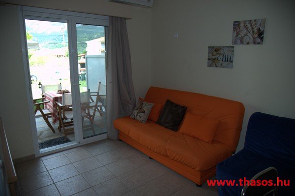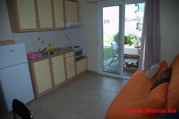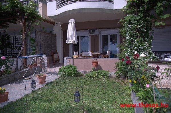 Az első emeleten egy csodálatos, nagyon tágas stúdió van, teljes kilátással a tenger felé. Az egylégterű nagy szoba franciaággyal, egyszemélyes ággyal és háromüléses kanapéval berendezett. Szükség esetén fotelágy is felszerelhető. A konyhasarok közepes főzési lehetőséget biztosít. A fürdőszoba tágas, zuhanyfülkés. A nagy erkélyről akadálytalan panorámás kilátás nyílik a kertre, az Aranypartra és az Égei-tengerre. A stúdióban kényelmesen elfér 5 fő.
