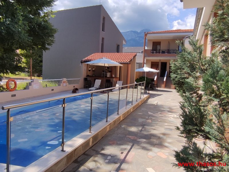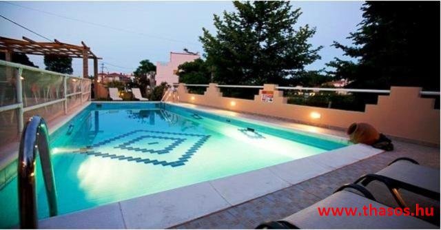 A medence az udvar belső kertjében 3,5m×8,5m nagyságú, 0,70-2,70m mélységű. A bár felőli medencebejáró a gyermekek részére 70 cm-es mélységű és kapaszkodó korláttal ellátott. Ahol a kapaszkodó korlát véget ér, ott kezd mélyülni a medence. A medence oldalán a fokozatos mélyülés számokkal megjelölve olvasható. Nem engedélyezett a medencébe való beugrálás. Este 21.00 órától fedve van, így az éjszakai fürdõzés sem lehetséges. A medence használata kizárólagosan a ház saját vendégei részére engedélyezett.