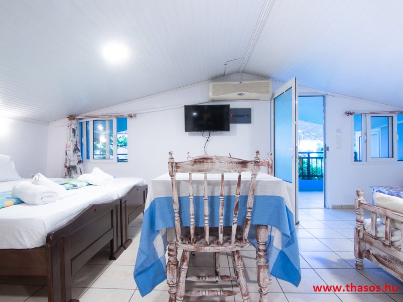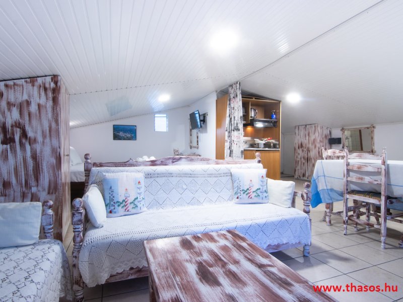 A főző sarok konyhájához étkezősarok tartozik, a kiképzett nappali részben , plazma Tv , légkondicionáló berendezés szolgálja a vendégek kényelmét. A fürdőszoba közepes méretű , zuhanytálcás.