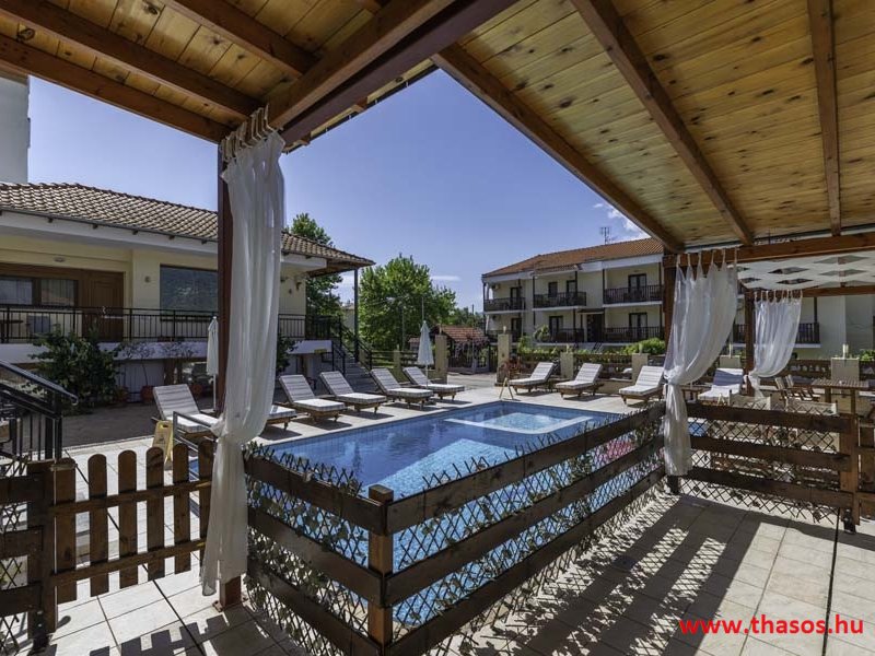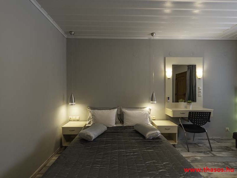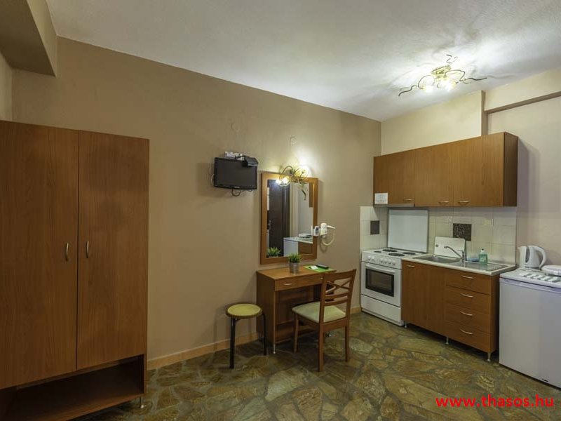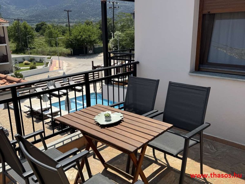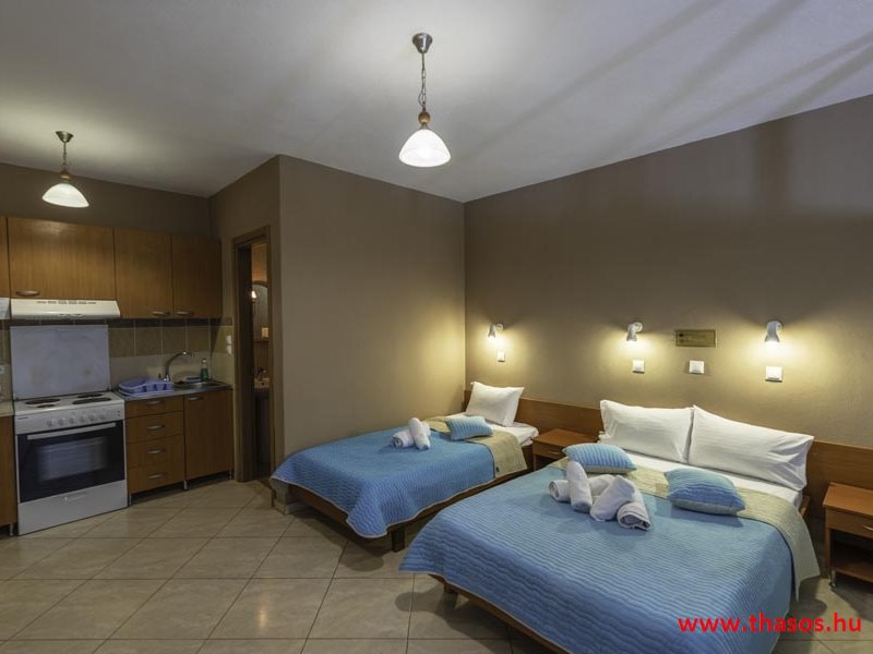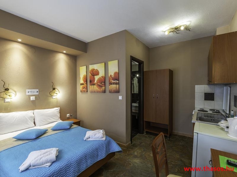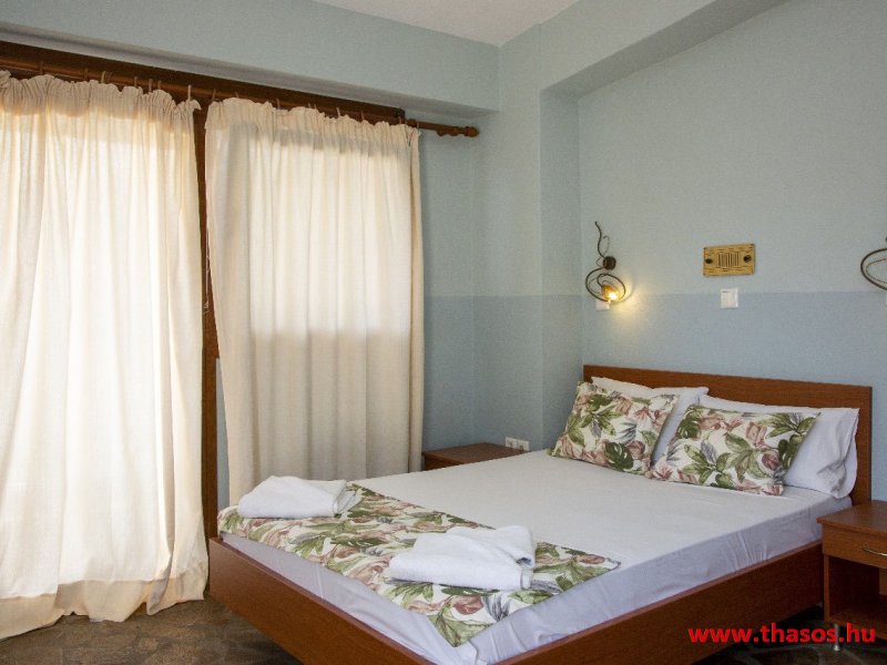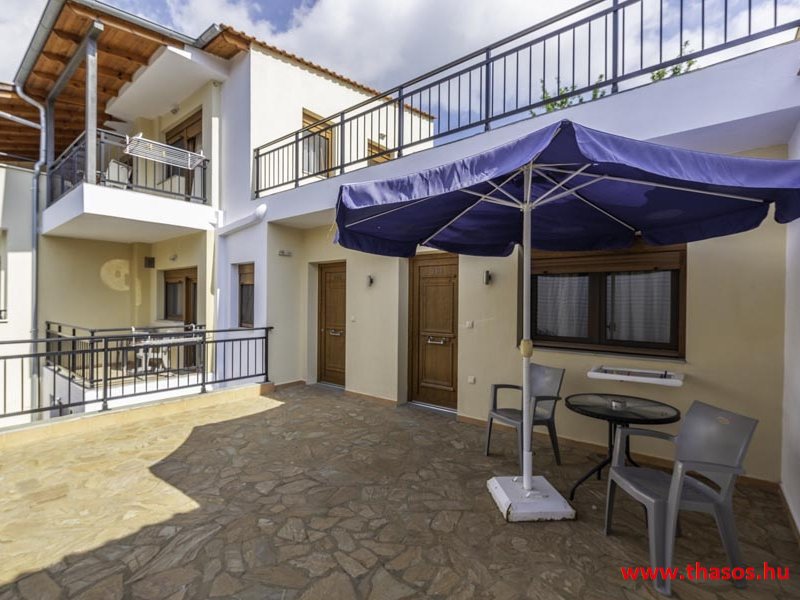 2026. évre új élet költözött ebbe a szálláskomplexumba. A gyönyörű szállás Skála Panagia camping part területe felett van. A szállás csupán néhány lépésre áll az Égei-tenger türkizkék vizétől és a híres Chrysi Ammoudia, azaz Aranypart strandtól. A közelben kristálytiszta vizű strandok, helyi taverna éttermek hagyományos ízekkel és festői ösvények találhatók, ahol sétálhat a tengerparton. A komplexum közepén egy lenyűgöző közös medence, amely ideális hűsítő csobbanásokhoz és pihenéshez a görög nap alatt. A medence speciális biztonsági intézkedésekkel van ellátva a gyermekek számára, hogy biztonságos és gondtalan élményt nyújtson a családok számára. Kényelmes napozóágyakkal és árnyékos területekkel van kialakítva, ideális környezetet teremtve a medencézés élvezetéhez. A lakások része a teljesen felszerelt konyha gyors ételek elkészítéséhez, valamint a hűtőszekrény. A lakások erkélyei tágasak, berendezettek, mint egy kis privát oázis. Ez a ház családi nyaralásra vagy párok részére ajánlott, kik természeti kalandokra vágynak. Teljesen felszerelt stúdióink és apartmanjaink ötvözik a modern kényelmet és az autentikus görög hangulatot. Csodálatos kilátást a tengerre és a zöld hegyekre. A ház közelében az ellátottság biztosított. Skála Panagia öböl közép-keleti részén mi található, mely a nyaraló vendégek ellátását szolgálja? Szupermarket, hentes, pizzériák, gyros tavernák, halas tavernák, kis kocsmák, élőzenés éjszakai parti taverna mind a szálláshoz közel. Élet és nyugalom harmonikusan. A szálláshoz tartozó partszakasz az öblünknek a kempingnél lévő lassan mélyülő, márványporos, hosszú bemenetellel, sekély, meleg vízzel rendelkező része. Lehetséges a napágy bérlés is, de lehetőség van saját törölközős csendesebb partszakaszt is választani. Ami miatt még igen kedvelt ez a partrész, az a három típusú vízisport lehetőség. Három vállalkozó bérel itt helyet: vízi sport, vízi járművek és kifejezetten kisgyermekesek részére vízi paradicsom ugráló is választható. A szálloda vendégeinek egyik legszebb élménye a különleges medencénkben való fürdőzés. A ház komplexuma rendelkezik kétágyas egy légterű stúdiókkal, háromágyas egy légterű luxus stúdióval, mazonett belső szintes apartmannal és a normál egy hálószobás apartmannal. Mindegyike kényelmes, magas színvonalú. Hangulatuk nyugodt, barátságos és kellemes. A vendégek maximális kényelme érdekében a lakások úgy lettek kialakítva, hogy a meghatározott számú személyt tudjanak befogadni, és nincs lehetőség pótágyak hozzáadására. Ez biztosítja az elegancia és a funkcionalitás ideális egyensúlyát, megőrizve a tágasság és a kényelem érzését. Egy légterű stúdió lakásai : Egyedülálló szállásélmény a fényűző és világos stúdióban, amely ideális azoknak a pároknak, akik eleganciát, kényelmet és nyugalmat keresnek. Modern kialakításával és kiváló minőségű felszereltségével ez a szálláshely ötvözi a luxust a hangulatos légkörrel, így tökéletes helyet teremtve a pihenésre és a feltöltődésre. A hálószobás apartmanok: Tágas, kényelmesen berendezett nappali - étkező, teljesen felszerelt konyhával rendelkeznek . A különálló hálószoba ideális környezetet biztosít a pihentető alváshoz, míg az elegáns belső kialakítás ötvözi a modern esztétikát a praktikummal. Tartózkodását további szolgáltatások teszik még kellemesebbé, mint például a műholdas TV a szórakozáshoz, a széf a személyes tárgyainak biztonságához és az ingyenes piperecikkek a modern fürdőszobában. A ház teljes korszerűsítése a mai friss színekkel, bútorokkal, anatómiai ágybetétekkel, stb. 2025 szezonzárás után történt, amiről szezonkezdet előtt fotógaléria frissítést teszünk. Addig is a régi képek állnak rendelkezésünkre. Superior stúdió Kétágyas stúdió Apartman Maisonette Executive stúdió Standard háromágyas szoba, földszinten Standard családi apartmanszoba, földszinten Basic háromágyas szoba, 1. emelet Basic családi apartmanszoba, 1. emelet Medence felőli oldal: Kert felőli oldal: A megadott ár tartalmazza az extra, helyben fizetendő turisztikai adót is. A mazonette és az apartman esetén az árak 4 fő/éjszaka/lakásra vonatkoznak. Azok lehetnek 5 fősek is. Térítési díj az extra főre 10 Euró/éjszaka/mazonette vagy apartman lakás. Egyéb lakások nem pótágyazhatók. Összesen 20 lakással rendelkezik a teljes házkomplexum. Közvetlen medencés lakások, mazonettek, apartman és a standard lakások. Egy lakás esetén: Érkezés és a lakás elfoglalása 14:00 órától. Távozás és a lakás átadása: 10:00 - 11:00 óra között. Képek a szállásról Superior stúdió Kétágyas stúdió Apartman