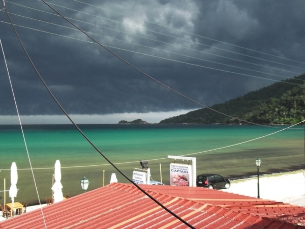 Potamiában a Topcisznál megálltunk, hogy gyorsan vegyünk valami ennivalót, tejet, kenyeret, mézet, olajat, paradicsomot… Fölnéztünk a falura meg a hegyre… hm… felhőben van a hegy teteje… Ági meg fönt van a csoporttal… De aztán már ott is voltunk a Viki parti háznál. Ahogy lefékeztünk, esőcseppek, szélroham, a felhők és a víz hihetetlen színjátéka… amíg fölvittük a cuccot, kitört a vihar. Láttam már vihart itt az öbölben… az is emlékezetes látvány volt… de most egész más színeket mutatott a természet. Cipelés helyett rohangáltam a fényképezőgéppel… Aztán elállt az eső, és a víz fölött a sötét ég előtt felragyogott egy szivárvány.
