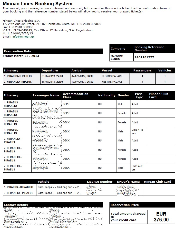 Valamikor 2012 karácsony környékén szokás szerint felmerült a kérdés: „Hova menjünk jövőre nyaralni?” Egy valami biztos volt, az ország, de azon belül hova? Nem is emlékszem pontosan, hogy ki mondta először Krétát. De mint lehetőség elkezdett foglalkoztatni. Olvasgattam élménybeszámolókat, fórumokat, és egyre jobban beleéltük magunkat a nagy lehetőségbe. Azért a 100%-os döntés anyagi okok miatt még váratott magára. De március 22-én este minden eldőlt. Akkor vettem meg ugyanis a kompjegyeket a MINOAN társaságnál. Az ő áruk kedvezőbb volt, mint az ANEK, mivel az autóklubos ShowYour Card kártyámra adtak 20 % kedvezményt. A másik indok a márciusi döntésre a hétvégi WizzAir duplapontos hétvége volt (hitelkártyás vásárláskor dupla forintokat írtak jóvá, mint normál esetben).Persze a biztos döntésig több kalkulációt is végeztem, mivel felmerült a repülős magán út lehetősége is. De akárhogy számoltam, az autós út 4 főnek kb. 120 eFt-tal került kevesebbe, mint a repülős. Autós útnál a benzin- és autópálya-költségeket plusz a kompjegyet vettem figyelembe. Repülőnél pedig a repülőjegy árát, a feladott csomagok árát, és a 14 napos autóbérlés árával számoltam. Nekünk ez a 120 eFt többlet nem ért meg annyit, hogy gyorsabban odaérjünk. Hiszen már maga az utazás is a nyaralás része. Na jó, nem a legjobb, de akkor is. Már az úton lehet készülni a két hét csodára.