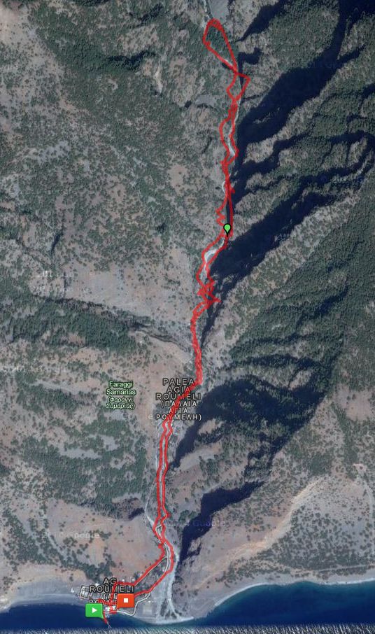 Ez a nap az én kedvemért történt, mivel én mindenképpen szerettem volna látni a Samaria szurdokot. Sajnos a család lány tagjai mindketten térdsérültek, így a hosszas hegyi túrázást nem tudják vállalni. Egyébként is azt mondják, hogy a túra eleje a legnehezebb, ott kell lefele jönni sokat és meredeken. Így kompromisszumot kötöttünk, és a neten csak „Light Samaria túrának” nevezett változatot választottuk. Magyarul autóval elmentünk Chora Sfakionba, onnét áthajóztunk Roumelibe, bementünk a kijáraton és felsétáltunk a szurdokba egy darabig, majd lesétáltunk. Valóságban a szurdok legszűkebb pontja feletti első pihenő és víznyerő helyig sétáltunk fel.A felvett útvonal a jobb oldali képen látható (kattintásra nagyobban is megnézhető). A teljes táv 9,3 km volt oda-vissza, melyet kényelmes tempóban 3,5 óra alatt teljesítettünk.