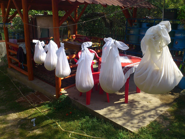 Beszélgetünk az udvaron koraőszi napsütésben, mesélünk az utunkról, a nyaralásról, az élményekről. Magdus mutatja a frissen elkészült filagóriát az udvaron, körülötte felaggatva a zacskókban érlelődő sajt.