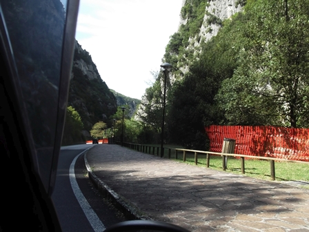 A Frasassi-szurdokban tovább haladva – mintha mindjárt összecsapnának fölöttünk a sziklafalak – van parkoló ott, ahol a Madonna di Frasassi kápolnájához indul föl a keresztút. A stációk számozásából látszik, mennyire lehetünk még a kápolnától De amúgyis lefoglal a meredek sziklafalak, a lent kanyargó folyó meg a partján vezető út látványa.