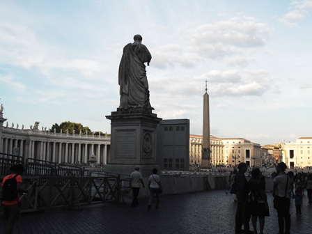 Végül elindultunk, vettünk buszjegyet, és az utca végén láttuk kifordulni a buszunkat. A következő 33-asra meg vártunk bő 50 percet a napon. Végül befutott egy, azzal elmentünk a Cipro metrómegállóig, ott pedig a 492-esre szálltunk át. Az csak negyedórát várt indulásig… arról a Risorgimentónál szálltunk le és besétáltunk a Szent Péter térre. Szívesen megkerestem volna az ellipszis középpontját (a kettő közül az egyiket), a szökőkút és az obeliszk között találhatók, de annyira tele van rámolva a tér kerítésekkel meg korlátokkal, hogy a labirintusban keringjen a fene.