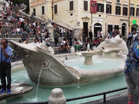 Aztán fölbaktattam a sűrűjébe. Ezt a helyet nekem muszáj volt látnom, mert ahány olasz filmet láttam, mindben szerepelt, és nagyon izgatott, hogy hol van. A tér túlsó oldalán a lovaskocsik várakoztak, de csak várakoztak, nem láttam egyet se elindulni vendéggel… A fociszurkolók által összetört Bárka-kút rendbehozva, rendeltetésszerűen üzemel. Maga a Spanyol lépcső rendeltetésszerűen tele emberrel