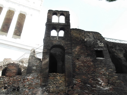 Balra, a két lépcsősor közti zöldben, Cola di Rienzo szobra. Tavasszal szerencsére a kezembe került egy könyv az életéről (Ugo Reale: A Szentlélek lovagja), örültem neki, mert semmit nem tudtam a középkori Róma életéről.