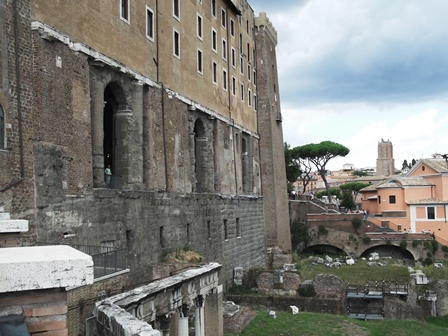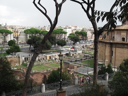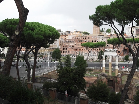 Jöttek már a felhők, hirtelen elkezdtek kopogni az esőcseppek. Ernyőt kibányászni… na menjünk lefelé. Odalent még egy kicsit elvoltam a császári fórumok meg a sugárút látványával. Kerestem a megfelelő szöget a fák lombjai között, ahonnan jól látszik Traianus oszlopa, és érzékelhető, hogy amilyen magas az oszlop, annyit hordtak el a domb lábából azért, hogy Traianus fóruma megépüljön.