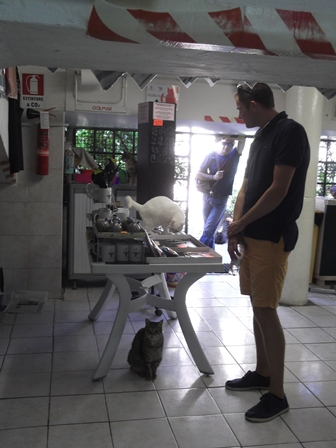 Ahogy mozdítottam a botomat, inkább érzékeltem, mint láttam, egy macska megmerevedett a lábamnál. Próbáltam mozdulatlan maradni, kis idő múlva már meg tudtam simogatni. A nyavalyás direkt követelte is szép nagy állat aztán a többi turista is rácuppant és már egész tömeg simogatta Hova lehet lemenni azon a lépcsőn? annyian mennek lefelé… hát lent van valami macskamenhely vagy mi, macskák tömege, kint is, bent is a szuterén helyiségben is… ketrecben is néhány, azok biztosan gazdikereső példányok. Lehetett szuvenirt venni a macskák számára adományként, de bizony meglehetősen drága volt, annyi pénzt nem vittem magammal.