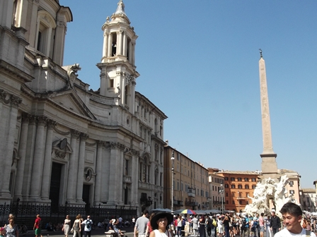 Kint a téren a padon ittam ki, aztán végigcsalinkáztam a nagy téren, megpróbáltam nézegetni a Folyamok kútját… de nem lehet elmélyedni, mert az ember mindig útban van valakinek, aki fényképezne… Megpróbáltam lefényképezni, de az ember mindig útban van valakinek, aki fényképezne…