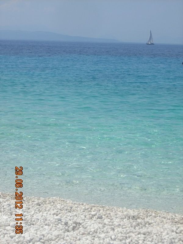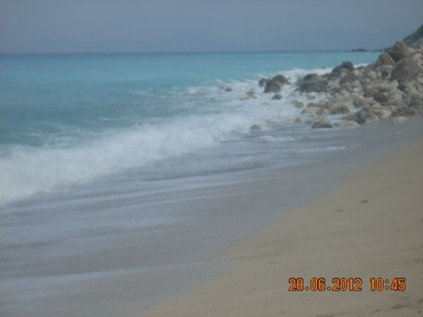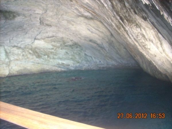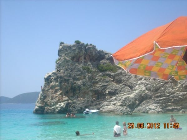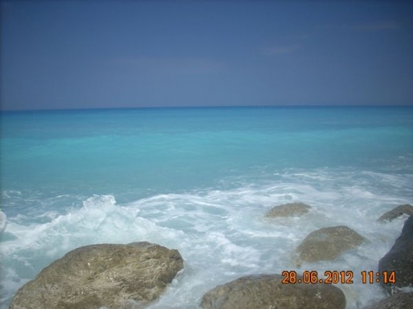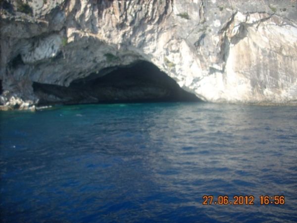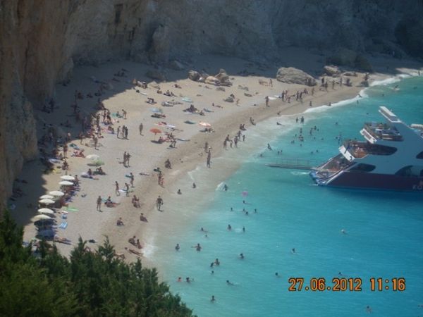 Ezt a helyet Eszter úgy jellemezte, olyan, mintha a Maldív-szigeteken lennétek. Igen! A színek lenyűgözőek, de ez jellemző az egész nyugati partra. A tenger, a fehértől a sötétkékig, 5-6 színárnyalaton keresztül, minden szín összemosódva, majd a távolban a nyílt tenger összeér a gyönyörű felhőtlen, tiszta, kék éggel. Leírhatatlanul szép! A part egy magas vörös sziklafal tövében húzódik meg. Ide kötött ki a hajó, sajnos csak 45 percre. Nagyon rövid idő volt. :( Ezt követően folytattuk az utat Kefalóniára, majd Ithakán kötöttünk ki, végül Meganisinél, beúszott a hajó abba a barlangba, ahonnan a második világháborúban lőtték az ellenséget. Befejezésképpen körbehajóztuk Scorpio szigetét, ami arról híres,hogy a görög hajómágnás Onassis család tulajdonában van. Itt lehetőség volt fürdőzésre is, aminek különösen a görög utasok örültek, de nagyon. Nem is értettük a lelkesedésüket, mert egy koszos, elhanyagolt parton kötött ki a hajó.
