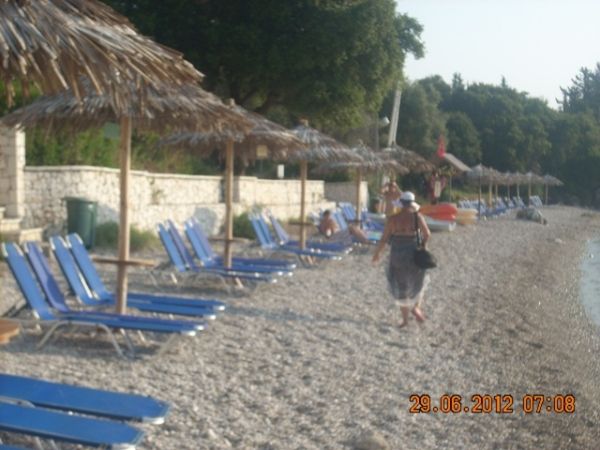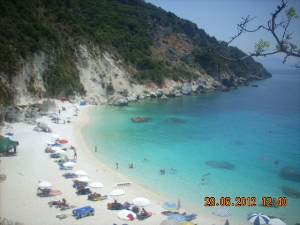 Egy másik alkalommal Vasillikiből kis hajóval - fejenként 6 euróért oda-vissza - jutottunk el Agiofilire. Csodálatos kis öböl, apró hófehér,lapos kövekkel. Szintén egy meredek sziklafal tövében. A bátrabbak motorral meg tudják közelíteni, bár elég rossz minőségű, szűk kis út vezet le a strand fölé. Autóval egyáltalán nem járható.
