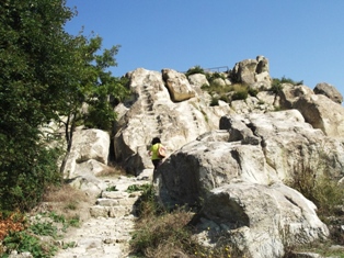 A parkolótól (ott barátkozott velünk egy kis vörös cica ) kiépített turistajárda vezet a szentélyhez. Ez nincs olyan magasan, mint Perperikon és kisebb is. De ez is tekintélyes méretű, és innen is szédítő lenézni az alant elterülő mezőre. Ez is az elmúlt évezredek tanúja. Magát a sziklát itt is csak az eredeti, kőbe faragott lépcsőn (már ha ez igazából lépcső – megmászható, de egyenetlen… ) lehet meghódítani.