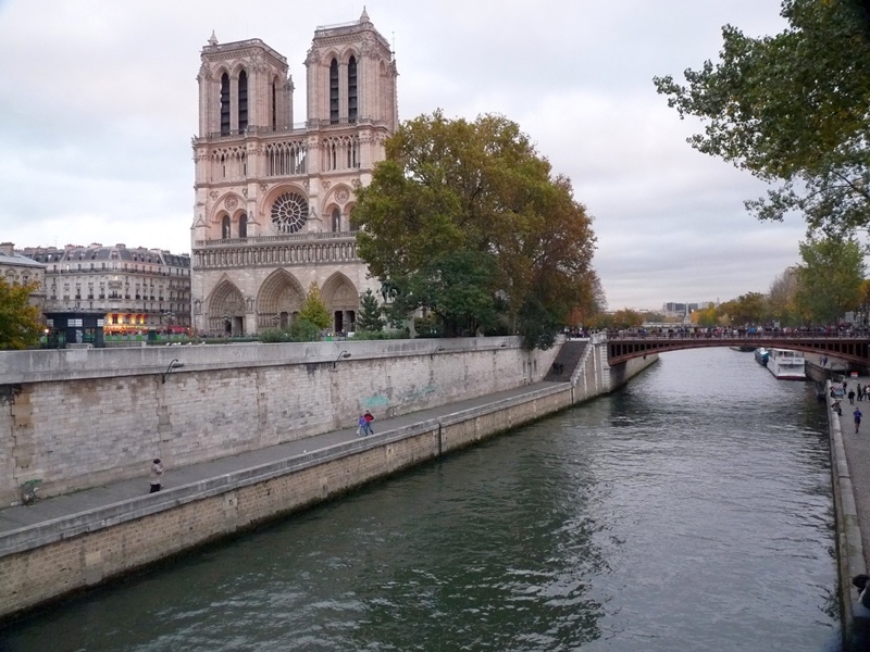 A Szajna partján található székesegyház története hosszú évszázadokra nyúlik vissza. A Notre Dame-nak nevezett templom alapkövének letétele III. Sándor pápa nevéhez fűződik. A hatalmas, gótikus stílusú templom évszázadokon keresztül készült. Több építész dolgozott rajta és a korábban itt található ókori Szent István katedrális terveit használták. Az alapkövét 1163-ban helyezték le, de a nyugati homlokzaton található két monumentális torony a mai napig nincs befejezve, hiányzik ugyanis mindkét kupola. Valószínűleg ez már így is marad. A Notre Dame belső méreteivel is rabul ejt. Ottlétünkkor egy lánykórus éneke zengte be a csodálatos akusztikájú templomot. Borzongatóan gyönyörűséges volt.