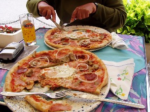 Kobaridban (történelemben caporettói áttörés, 1916) megnéztük a múzeumot. Van a dombtetőn egy háborús emlékhely, egy templomszerű építmény, ahova odahordták mindkét háború halottait, de a felvezető utat sikeresen elpasszoltuk sajnos. Aztán beültünk ill. kiültünk egy kocsmaszerű (csak annál civilizáltabb) hely elé a járdára rakott asztalokhoz. Ott alapból olaszul beszélt a pincér… Kértünk pizzát. Az étlapon sok pizza volt… olyat választottunk a rávalók alapján, hogy az volt a neve, „bomba”. Volt rajta erőspaprika is. Aaaaaakkora malomkereket hoztak… akkor értettük meg, a pincér miért firtatta, hogy egyet vagy kettőt kérünk-e… de betermeltük!
