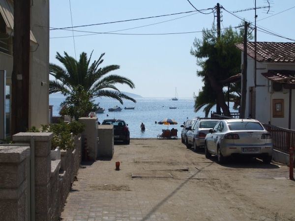 Mivel éppen a falu közepén lakunk, egyből dönteni kell, hogy melyik irányt válasszuk. Végül Assini felé indulunk, a főutcán, sétálgatva, nézelődve. Szépen lassan haladva eljutunk majdnem az öböl végéig, amikorra is már nagyon melegünk van, itt a hűsölés ideje. Előbb betérünk egy kis büfébe, ami klasszul árnyékolva van felülről, és belülről hűtjük le magunkat. Ki ezzel, ki azzal, én egy frappéval. Majd átsétálunk a túloldalra, és ott rögtön le a vízhez.