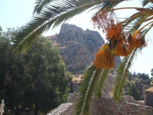 Aztán autóba pattanunk, és megcélozzuk az első felderítendő látványosságot. Kb. 1 óra alatt érünk az Acrokorinthosi vár alá, és némi hezitálás után be is kanyarodunk a felfelé vezető útra. A vár egy domb vagy hegy tetején áll, messziről csak a domb látszik, olyan, mintha egy kőgolyó állna magányosan. A kőfalak annyira beleolvadnak a háttérbe, hogy csak közelről látszik, hogy van valami a tetején.