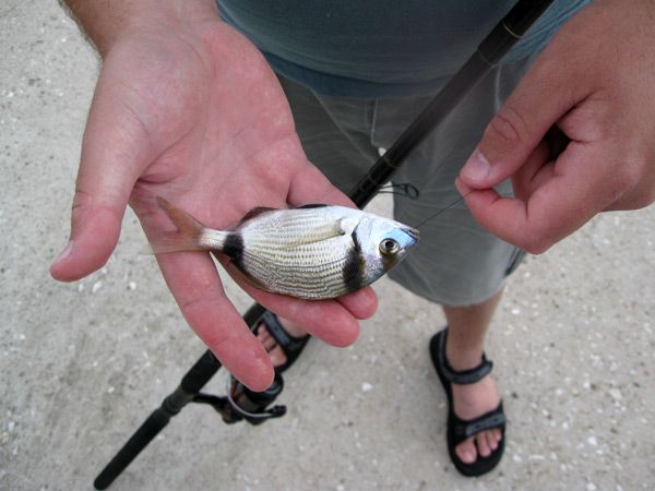 Miután éppen elég csíkos sügért fogtam, észrevettem, hogy a közvetlenül a part mellett tengeri gébek pihennek a kövek között. A csontit eléjük lógatva egy pillanat alatt elnyelték a felkínált csalétket. Ezeket is alaposan megtizedeltem, így ittlétem alatt ez lett a harmadik halfaj, amely áldozatul esett nekem. Aznap kíméletes kedvemben voltam, így az összes kifogott halnak visszaadtam a szabadságát. Sajnos, az utolsó horgászatom alkalmával sem tudtam tovább maradni egy óránál, mivel a perzselő napon alaposan leégett az alkarom és a lábam. Miután otthon levettem a szandáljaimat, úgy nézett ki a két lábfejem, mint két vörös-fehér csíkos bohóchal.