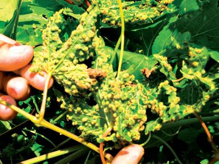 A filoxérával fertőzött szőlő levele buborékosan összepöndörödik, majd elhal.