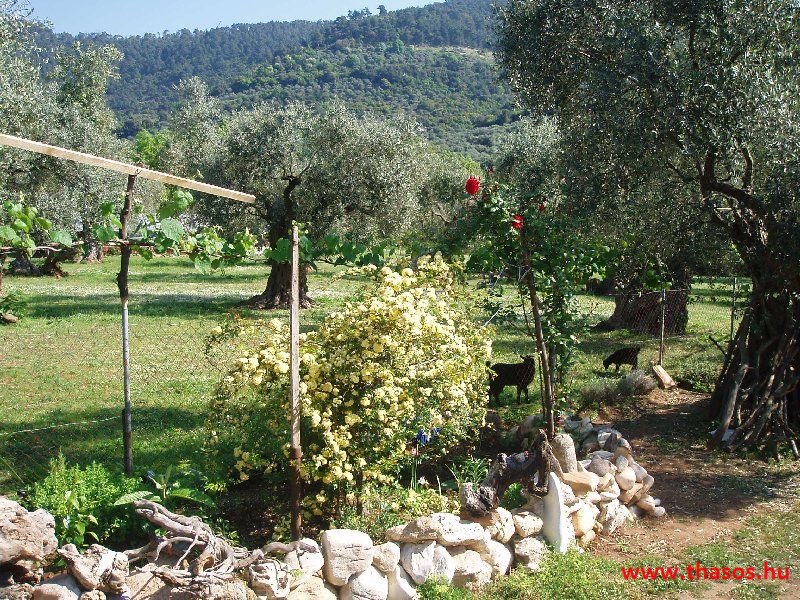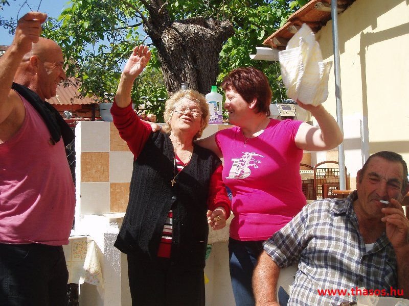 Mi kora reggel még egy kis kerti munkát terveztünk, de a szomszéd ránk rivallt, hogy ma senki nem dolgozik, maximum főzhet. Így 10 órára az egész szomszédság és rokonság összegyűlt Nikoszékhoz és megkezdtük a sütögetést. Volt kolbász, kecskesült, polip, kecskéből zöldséges fehérszaftos frekaszé,- ez a kedvencem-, meg 10 féle saláta. Mind finomabbnál finomabb. És volt egy szakácsunk is, aki irányította a menetet. Ezen jót nevettem, mert Pános mikor meglátta a szakácsot, örömmel üdvözölték egymást, majd a fülembe súgta : Ő az észak-görög legelismertebb szakácsa! Valóban isteni dolgokat ettünk a keze által. Viszont vasárnap, mikor Efivel pletykáltuk ki a történéseket, őnekik szintén észak-görög legelismertebb szakácsa főzött!