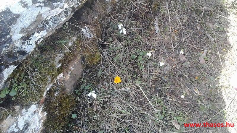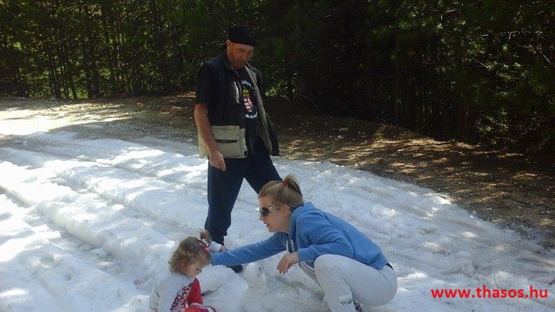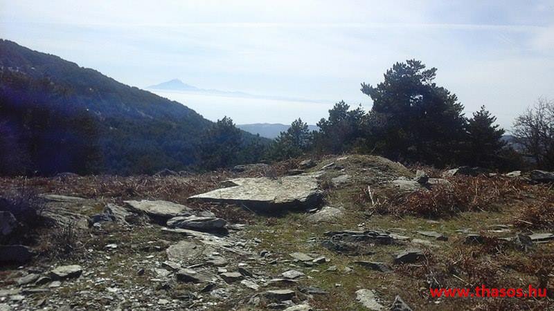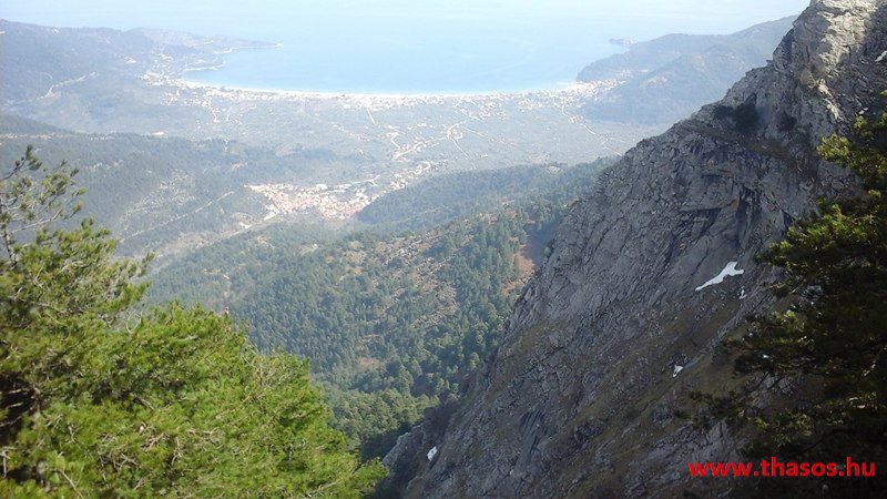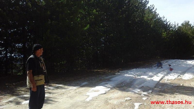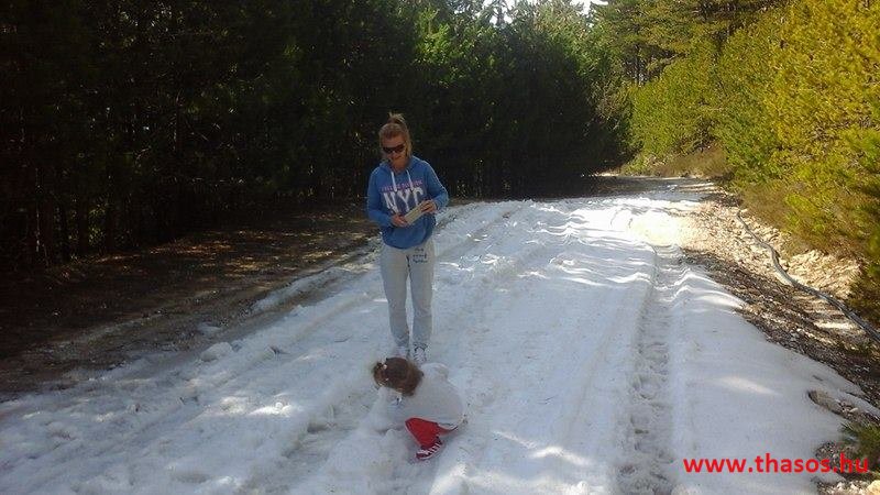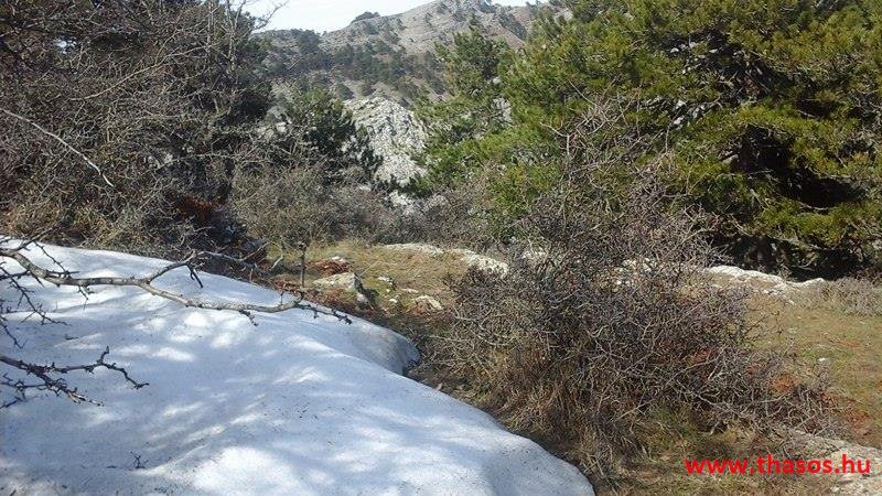 Utunkat folytattuk felfelé a menedékházhoz. A tiszta atmoszféra csodálatos tájat mutatott a sziget belsejéről és a sziget déli tengerpartjáról, valamint a távoli Athos nyúlványról. Az út végig tökéletes volt. A forrást ahogy elhagytuk, kissé meglepődve álltunk meg. A partvidékről ahogy a hegyre nézünk, lehetett látni a fehér foltokat. Sejtettük, hogy fogunk majd hóval találkozni a csúcs felé, de hogy közvetlen az úton lesz havas kalandunk, az váratlanul ért bennünket. 30-50 cm vastagságú jéggé fagyott foltok voltak az úton. A menedékház forrása előtt szinte teljes hosszúságban ott volt a hó. Utolsó havazásunk február 11-én volt. A hegy ezen szakaszát a nap keveset érheti, és valószínű az első decemberi hótól február közepéig csak gyűlt-gyűlt a sok hó, így maradt a 3 hetes napfényes idő ellenére is.