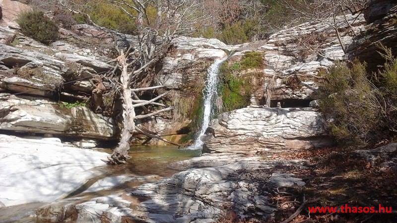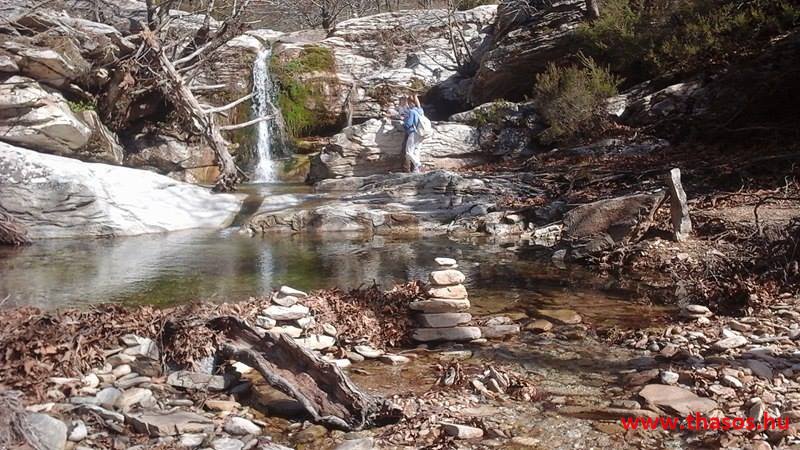 A vízcsobogás, a szél elcsendesülő, majd felerősödő játéka, mindenféle madártrilla, a fenyőtoboz kipattanásának alapzaja, ezek mind-mind egy édes dallamként fogadtak bennünket. A mindenfelé sárgán világító kicsiny krókuszok, a hó alól kibukkanó hóvirág, a kicsiny cserjék hamvas üde zöldje. Minden oly szép, oly fenséges, leírni azt nem lehet. Érezni kell azt. Flekkeneztünk, pihentünk, majd kora délután hazaindultunk. A Jenna tónál újra megálltunk. Tudatosan. Akik gyalogtúrával mennek oda Mariesből, a mézárus placc előtt a sziklaoldalban van egy, túrázók által a sziklára tett jelölés. Nyíl mutat lefelé, a sziklára rajzolva. Nyíl és Ypsárió. A járatlan túrázót ez arra készteti, hogy az igen meredek falon felkapaszkodjon. Pedig a nyíl lefelé mutat. De ha már felmászott, úgyis rájön, hogy oda feleslegesen mászott fel. A nyilat szembe mutatónak szánták, akik felfestették. Jelzik, hogy szemben az Ypszárió egy patakjának a kb. 6 méter magas vízesése van. Ez a tó mögötti folyó szurdokvölgyben, igen rejtett úton található. A látvány mindent megér. Leereszkedtünk hát a mélybe a nagy-nagy vízeséshez. E vízesés nem a tótól jön. A tónak a vizét vastag csőbe gyűjtik és vezetik Maries hegyi falujához. Az Ypsárióról több patak a hegy nem járható részein csörgedezik, és itt is a felületes gyors turista számára örökre rejtve marad. A vízesés patakja egészen Mariesig halad. Több belső kis tóval csipkézett, óriási platánokkal szegélyezett. Mariesnél a vizét hasznosítják, majd a többletet engedik aláfutni egészen a 12 km-rel lentebbi parti falurészbe, hol a tengerbe fut. A hegyi Maries alatt van egy kápolnánál egy kiépített pihenő park. Odáig még nyár végén is csordogál a vize. De onnan tovább elveszik. Ki tudja, talán az állattartók, vagy a márványfeldolgozó üzem használja azt fel.