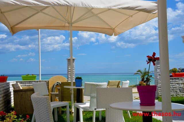 A kétemeletes ház közvetlen a tengerpartra épült, napágyas strandolási lehetőséggel, melyek a szállás szolgáltatásaként csak a ház vendégei részére használhatók.