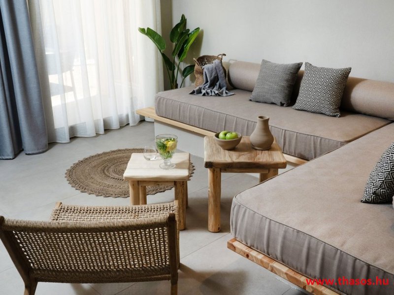 Ezekben a lakosztályokban egy csendes menedéket talál, amely ideális a teljes kikapcsolódáshoz és békéhez. A harmadik épület földszintjén találhatók, 32 négyzetméter alapterülettel. A lakosztályok a nyugalom végtelen pillanatait kínálják azáltal, hogy a meleg földszín-kombinációkat és a minimális dekorációt ötvözik a saját nyugágyak használatának lehetőségével a lakosztály terasza előtt, ahonnan egyedülálló kilátás nyílik a tengerre. Minden lakosztályban a nappaliban egy franciaágy és két egyszemélyes ággyá alakítható kanapé található, és akár 4 fő elszállásolására is alkalmas, kényelmes és pihentető élményt nyújtva.