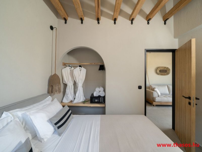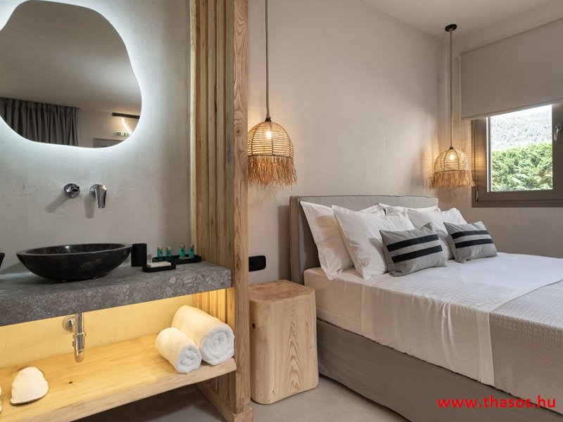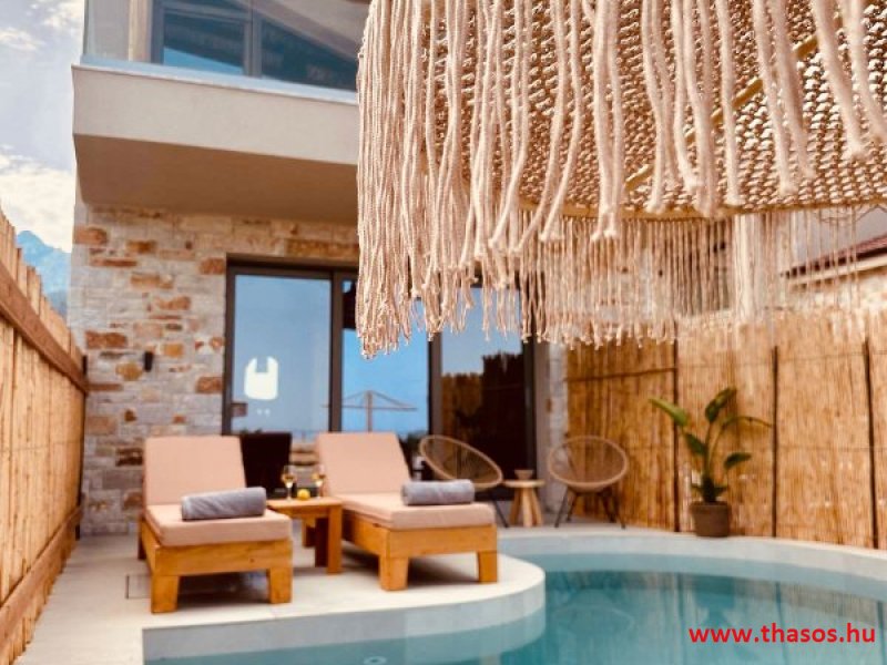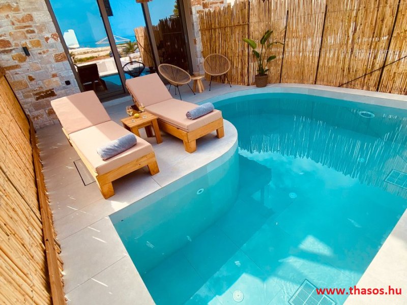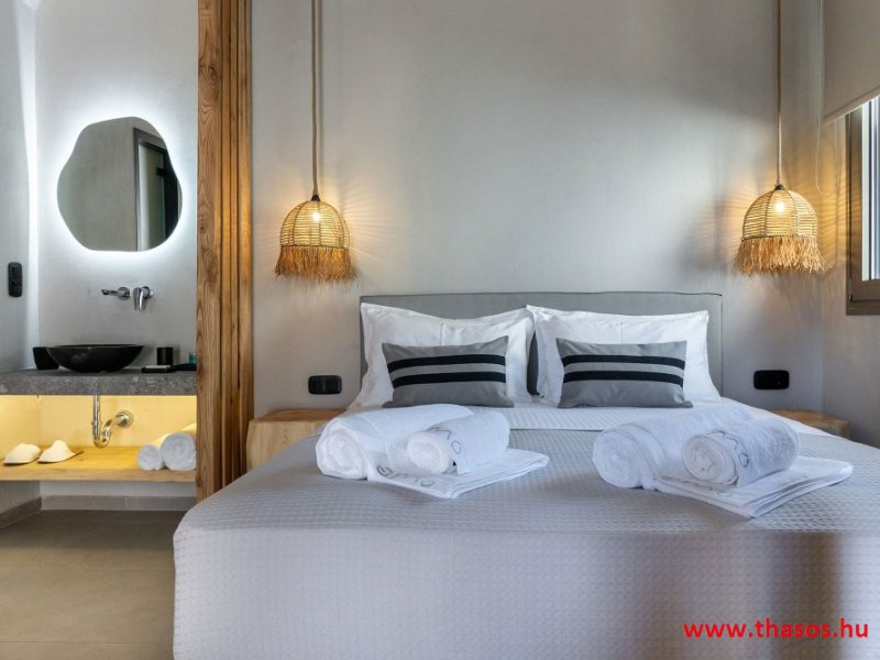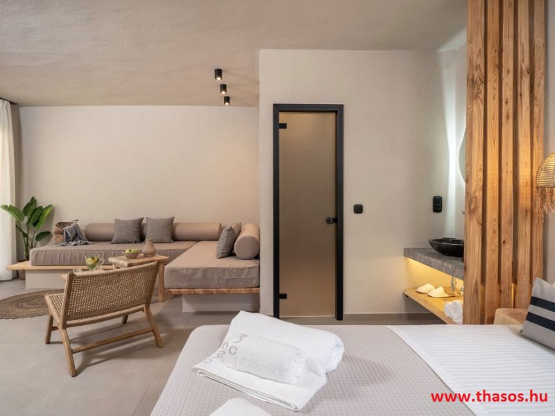 Elegáns, kétszintes, 44 négyzetméteres lakosztályaink a magán medencés hotel elején, a tengeri frontján találhatók. Ezek a kétszintes lakosztályok lélegzetelállító kilátást nyújtanak az Égei-tengerre, ötvözve a víz egyedi smaragd árnyalatait a földi hangulattal és a bohó-minimális esztétikával. Minden természetes anyagokkal berendezett. Kővel, fával, bambusszal díszített lakosztályban két hálószoba található, amelyekben különböző szinteken található kétszemélyes ágyak és egy nappali kanapéval vannak. A felső szinten egy tágas erkély is található, ahol a vendégek pihenhetnek és élvezhetik a mélykék tenger és az aranyló homok lenyűgöző kilátásának, a tengeri szellő, a felejthetetlen táj és a csodálatos napfelkelte kombinációját. A földszinti lakosztályban egy látványos szabadtéri medence található, hűs vízzel és teljes panorámával a kék Égei-tengerre.