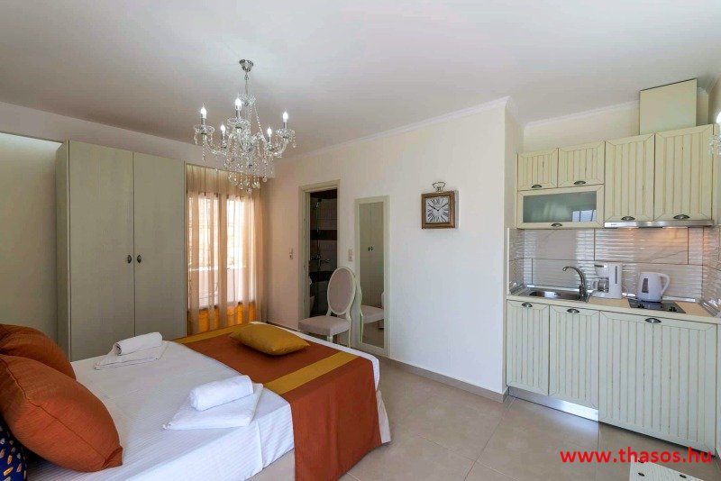 A nagyméretű hálószobában franciaágy van. A nappaliban kettő nagyméretű egyszemélyes kanapé A modern konyhasarok a nappali részben van Légkondicionáló berendezés, plazma Tv.