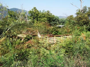 Ez is a nagy előkészítésnek esett áldozatul. Ahogy mentünk, láttam egy táblát, hogy erre, láttam is egy keskeny betoncsíkot fölkúszni a dombra, de majdnem függőlegesen. Ó, nem… hát én kikerestem, honnan lehet menni… aha… ahol meg lehetett állni az autóval, ott még volt tábla, aztán ahol elágazott az ösvény háromfelé és még a patakon is át kellett kelni, ott már nem volt jelzés… na merre? vissza.