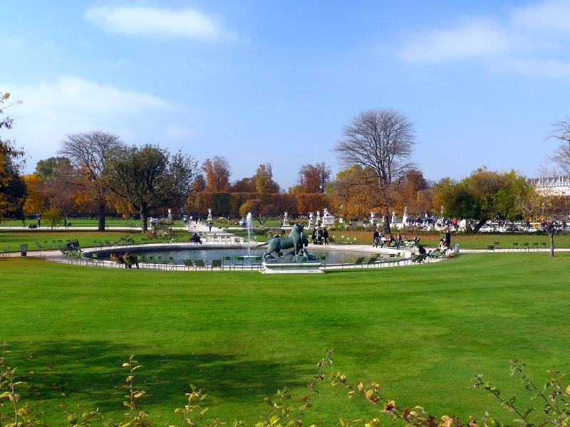A Dóm után a Concorde téren áthaladva a Tuileriák kertjébe sétáltunk. Párizsban egyébként is rengeteg park és kert található. Különleges látványt nyújtanak a fák a szögletesre nyírt lombjukkal. A Tuileriák kertje a Szajna jobb oldalán a Concorde tértől majdnem a Louvre-ig húzódik. 1564-ben Medici Katalin palotája elé alakították ki a reneszánsz stílusú kertet, amelyet később XIV. Lajos rendeztetett át kertészével. A Palota több uralkodó lakóhelye is volt - míg le nem rombolták. Többször bővítették, alakították. Napjainkban a kert igen népszerű mind a párizsiak, mind a turisták körében. Palota ma már nem áll itt. Mire a kertbe értünk, már gyönyörűen sütött a nap, felmelegítve a sétálókat és csodálatos színekkel kápráztatva el Párizs szerelmeseit. Mert azok lettünk. Visszavonhatatlanul.