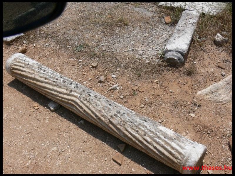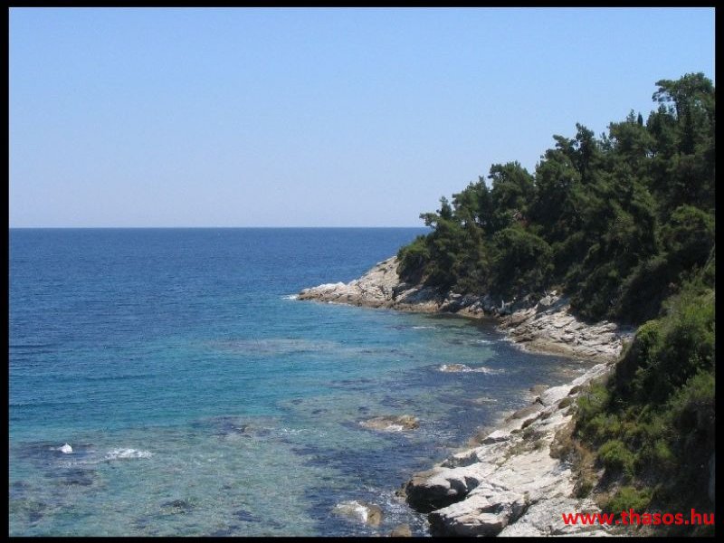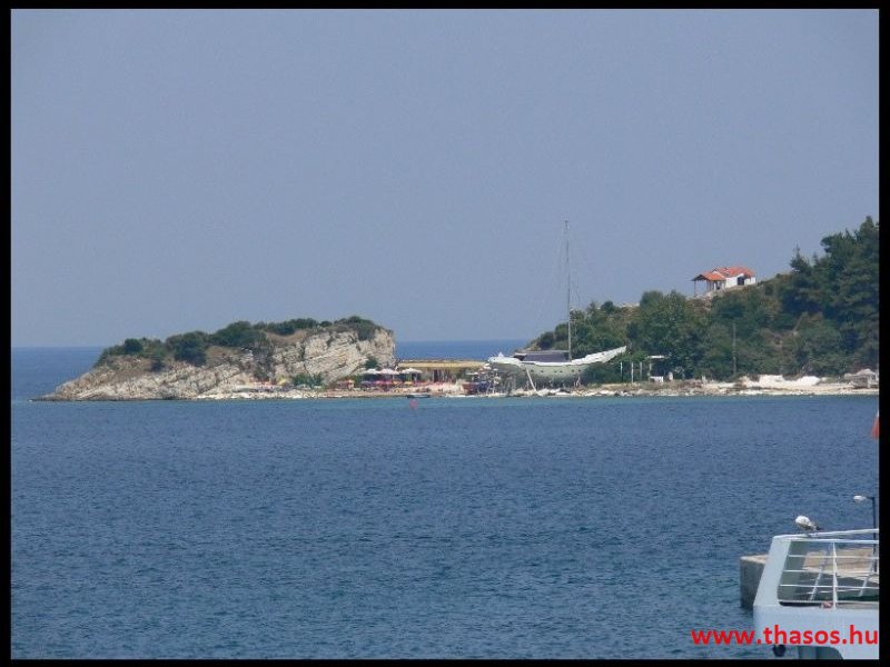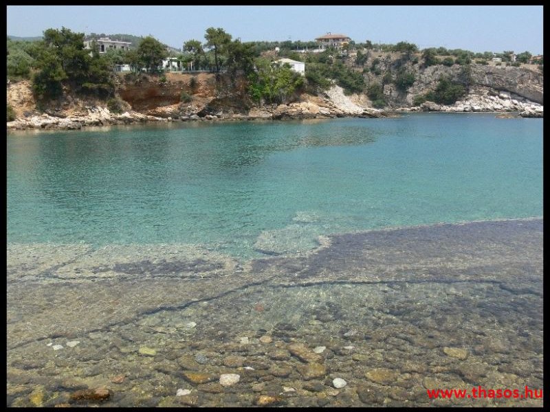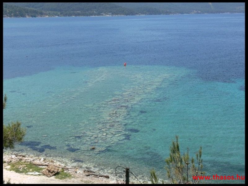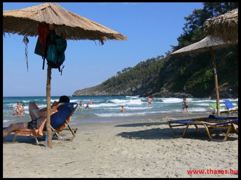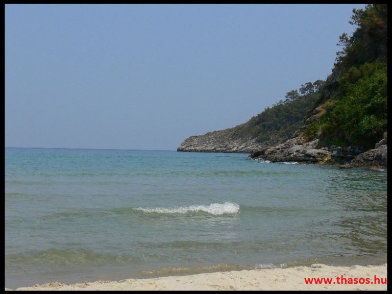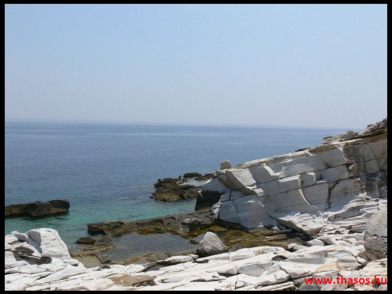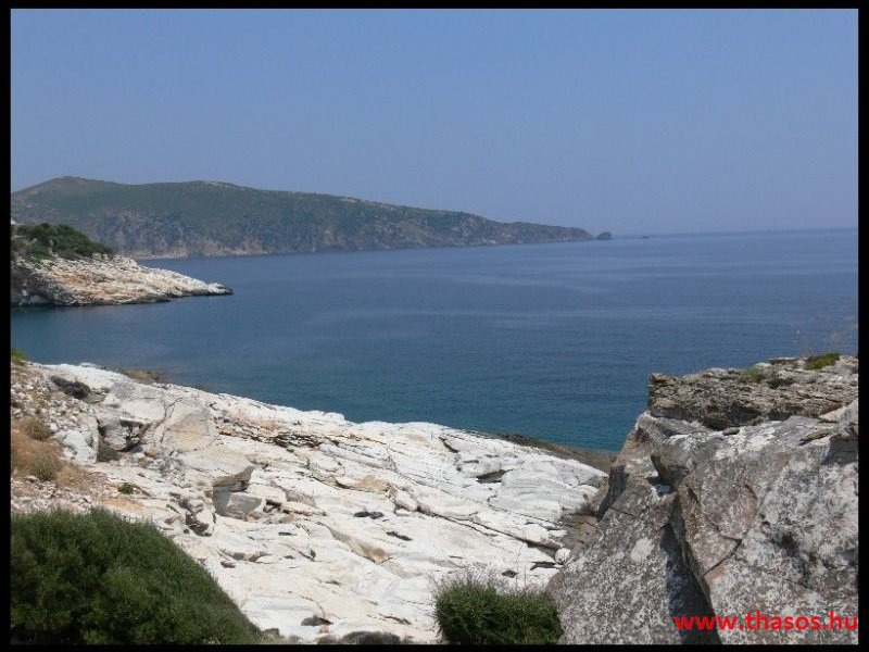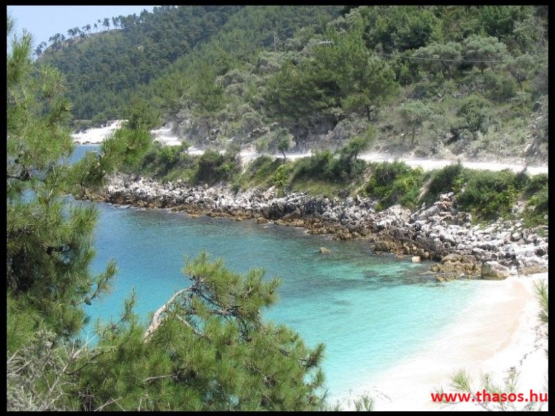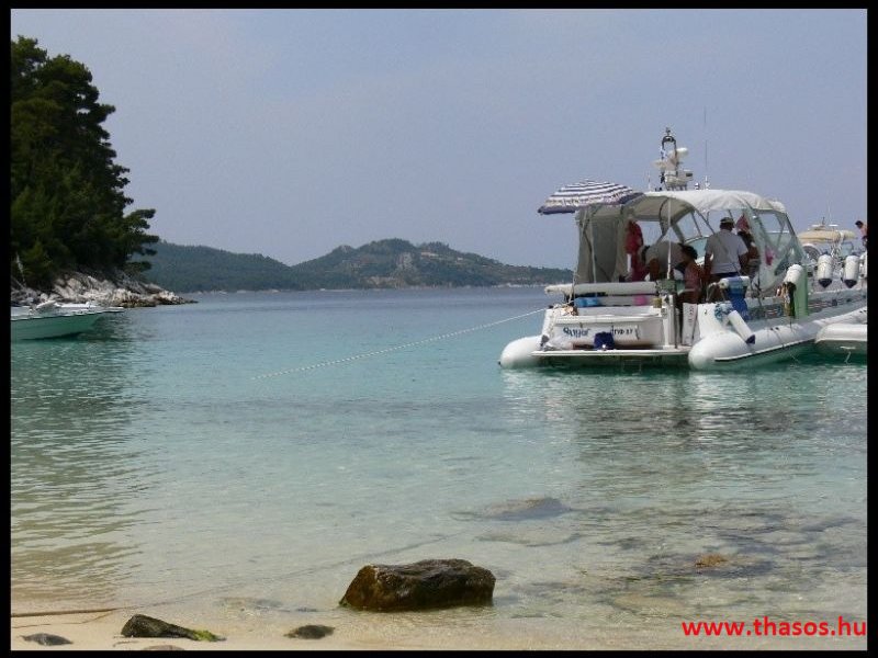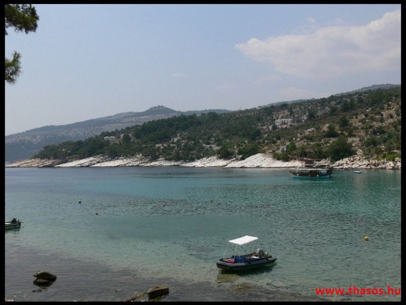 A napot egy, az elmondások szerint varázslatos part felfedezésére szántuk. El is indultunk reggeli után a fõváros irányába. A fõvárosba érve nem sokkal a fõútról való lehajtás után jobbra Makriammos fele kell venni az irányt. Ott nem kell elmenni a bejáratig (Makriammos strandja fizetõs), hanem elõtte jobbra le kell térni a földútra (térképen lilával jelölve). A jó minõségű földúton (mely vastagon márványporral van borítva, ami a sötét autónkon szépen nézett ki) 6 km-t kell menni, közben átmegyünk egy kikötõn, ahol a márványt osztályozva tárolják. 6 km után egy gyalogút ágazik balra lefele, mellette egy kis "parkolónak" kialakított hely. A gyalogúton lesétálva egy rendezetlen, de csodálatos part tárul elénk. A homok valószínűleg márványporból van, annyira finom. Viszont mindenkinek ajánlom, hogy ne hétvégén mennyen, mert délután 1 körül sorba jöttek a szebbnél-szebb, nagyobbnál-nagyobb jachtok, gondolom a helyi gazdagok, akik a hajón grillezték a tengerbõl frissen fogott finomságokat. Késõbb még egy turista hajó is megjelent rengeteg iskolással. Mivel az iskolásokkal "megtelt" a part, így úgy döntöttünk, hogy mi megyünk.