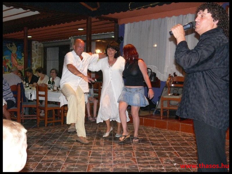 Az esti program autókázással indul. 4 autóval indultunk el Theologos irányába, de előtte megálltunk az Archaggelos kolostornál, ahol Ágnes mesélt a szigetről, a kolostor történetéről, majd bementünk és megnéztük, hogy miről is beszélt. Ezekután indultunk most már a végcélhoz. A műsoros est Theologosban, az Augoustos Tavernában került megrendezésre. A vacsora svédasztalos volt, a felnőttek bort, a gyerekek üdítőt kaptak az árban. A vacsora alatt élőzene, utána táncos műsor volt. Mivel Ágnest, illetve férjét jól ismerték a helyen kis csoportunk a legjobb 3 asztalt kapta, mely pont a "színpad" előtt volt. Így a gyerekek is mindent láttak és élvezték az előadást. Különböző táncokat adtak elő a táncosok, közbe-közbe pedig a közönséget is bevonták. Engem csak azért nem láthattok táncolni, mert a lányom elfelejtette a kamerán megnyomni a felvevő gombot. Pedig végig úgy csinált, minth.....