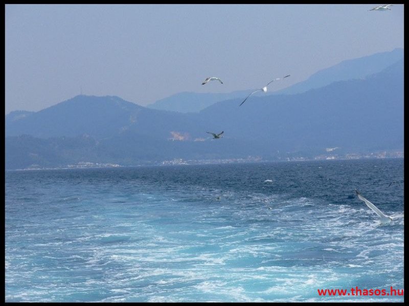 Hát ez a nap is eljött. Reggeli után az 500 literes csomagteret megpakoltuk, kifizettük a szállás fennmaradó részét (14*50 Euró volt a 4 fős apartman) és elindultunk haza fele. Útközben még elköszöntünk Ágnestől és megálltunk Panaggiában. Limenasban a part melletti bárban ettünk egy könnyű kis ebédet (salátát és pizzát), ittunk még frappét és elindultunk a komphoz. A 14:45-ös kompra már nem fértünk fel, mert megtelt, de a 15:45-ösre mi mentünk fel másodiknak, így az autónk az úton árnyékban állt.