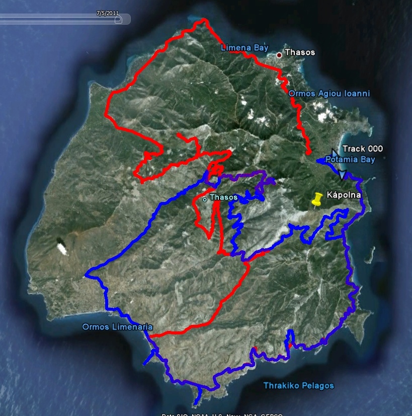 A másik tervezett program a Jeep túra volt. Mert az idén sem hagytuk ki a Jeep túrát. Mint tapasztalt Thassos járók nem Ági által szervezetten mentünk, hanem egy másik útvonalon, amit természetesen Ági ajánlott. (Az idei útvonalat kék szín jelzi!)A Suzuki Jimny-t a Potos-nál béreltük. Egyik este bementünk az irodába és megbeszéltük melyik napra kell a 2 db Jimny. A túra reggelén csak átvettük az autóka, felpakoltunk és már indultunk is Kinira felé.