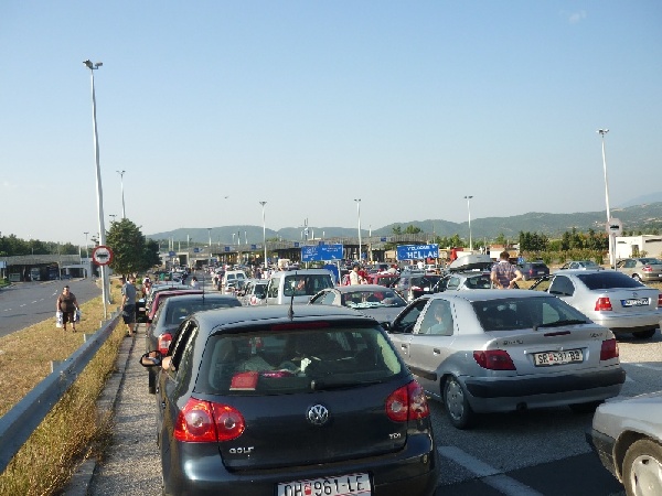Előzetesen egy kicsit tartottam a pénteki indulástól, azon belül is a határoktól, mert a turnusváltások szombaton vannak és a törökök is mennek haza. Ez részben be is jött. Az úton és a fizetőkapuknál nem volt gond, de a magyar és a görög határon igen. Itthonról még úgy indultam, hogy Tompa felé megyünk, de Kecskemétnél felhívtam a határőrséget (62/562-400), akik azt mondták, hogy nincs várakozás Röszkénél, ezért újraterveztünk. Ezután meglepetésként ért, hogy az autópálya még két sávos részén állt a sor a határig, kb. 500 m-es volt. A sor végénél ablakmosók, de szerencsére minket elkerültek, csak egy jó tanácsot mondtak, hogy a másik sor gyorsabban halad. Ebben igazuk volt, mivel az új sávok jobbra nyíltak, azért a jobb oldali sáv valóban gyorsabban haladt. Csak úgy érdeklődésképpen, 40 perc várakozás után felhívtam a határőr bódé előtt is a határinfót, akik ismét megnyugtattak, hogy nincs várakozási idő. Én nyeltem egyet és megköszöntem az információt. (Csak visszafele dörgöltem az orruk alá, hogy "remélem nem úgy, mint két hete, mikor a nincs várakozásra 50 percet vártunk".) Szóval nekünk nem jött be az előzetes telefonos csekkolás.