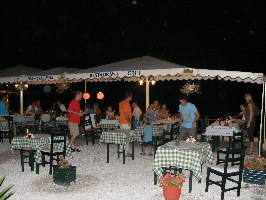 Ebédre Colát, fehérbort és Suvlakit kaptunk salátával, ami főtt burgonyát, paprikát, paradicsomot és lilahagymát tartalmazott – bevallom, fél fogra volt csak elég. Visszafelé, hogy még véletlenül se unjuk meg a csodálatos sziget látványát, hatalmas viharba kerültünk, ahol közel 6 méteres hullámok dobálták a hajót. Összesen 7 ember lett tengeribeteg (köztük egy ájulást is átéltünk) és egy baleset is érte a csapatot, így ismét nem tagadhattam meg EÜ-s előjáróságom: míg a rosszullevőket próbáltam megnyugtatni, s megfelelően ellátni, majdnem kiestem a hajóból, mely egyszerre volt kegyetlenül félelmetes és csodálatos is: így láthattam, hogy a hajó orra 6-7 méterrel magasabban van, mint a vízszínt. A leendő kapitány, jelenleg még csak a vendéglátás részével foglalkozó Nektarios az este folyamán a disconak nevezett kocsmában ki is nevezett az ő legjobb magyar doktor barátjának :) Persze nem is lenne kerek a történet, ha szerelmi szálak ne alakultak volna ki: Ági és Neki nagyon egymásra találtak az úton, melyről bizonyosságot is szereztünk a disco előtt Krisztináék bárjában. (Krisztina a szlovák utazási iroda helyi képviselője, élettársa Jorgos)