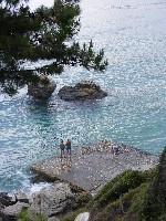 Déli kelésünk után nekiálltunk a hozott alapanyagokból valami ebédfélét készíteni (lecsót és galuskát sikerült összedobni), majd a tengerparti sétányon nézelődtünk. A lányokkal elmentünk felfedezni a kolostort és környékét – no meg megnézni, hátha visz gyalogút másik irányból is az öblünkbe. Nem visz, de a látvány minden esetre frenetikus volt! A város egyik legmagasabb pontjára épített, ma már romokban álló sárga épület éjjel-nappal az origóban van: folyamatosan világítják, mikor a nap sugarai már nem verik vissza a fényt róla. Mellette kisebb múzeum található: mitológiai szobrok, és egy régi épület maradvány van a hegytetőn, amiről sajnos nem tudtuk megállapítani, mit funkcionált annó, csak hogy reneszánsz stílusban épült fel.